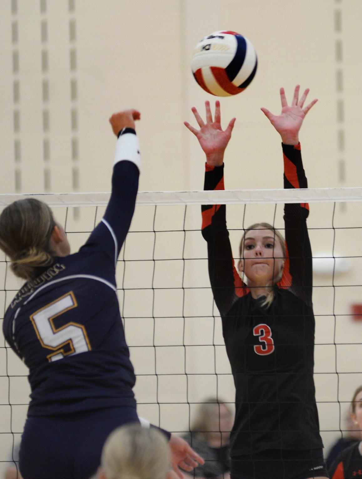 Kennedy Buck (13) and Lauren Abbott (11) reach to try to block a spike by Freeport Aquin’s Meghan Carlisle during the Oregon High School’s 2023 Volleyball Tournament on Sept. 1 at the Blackhawk Center in Oregon.