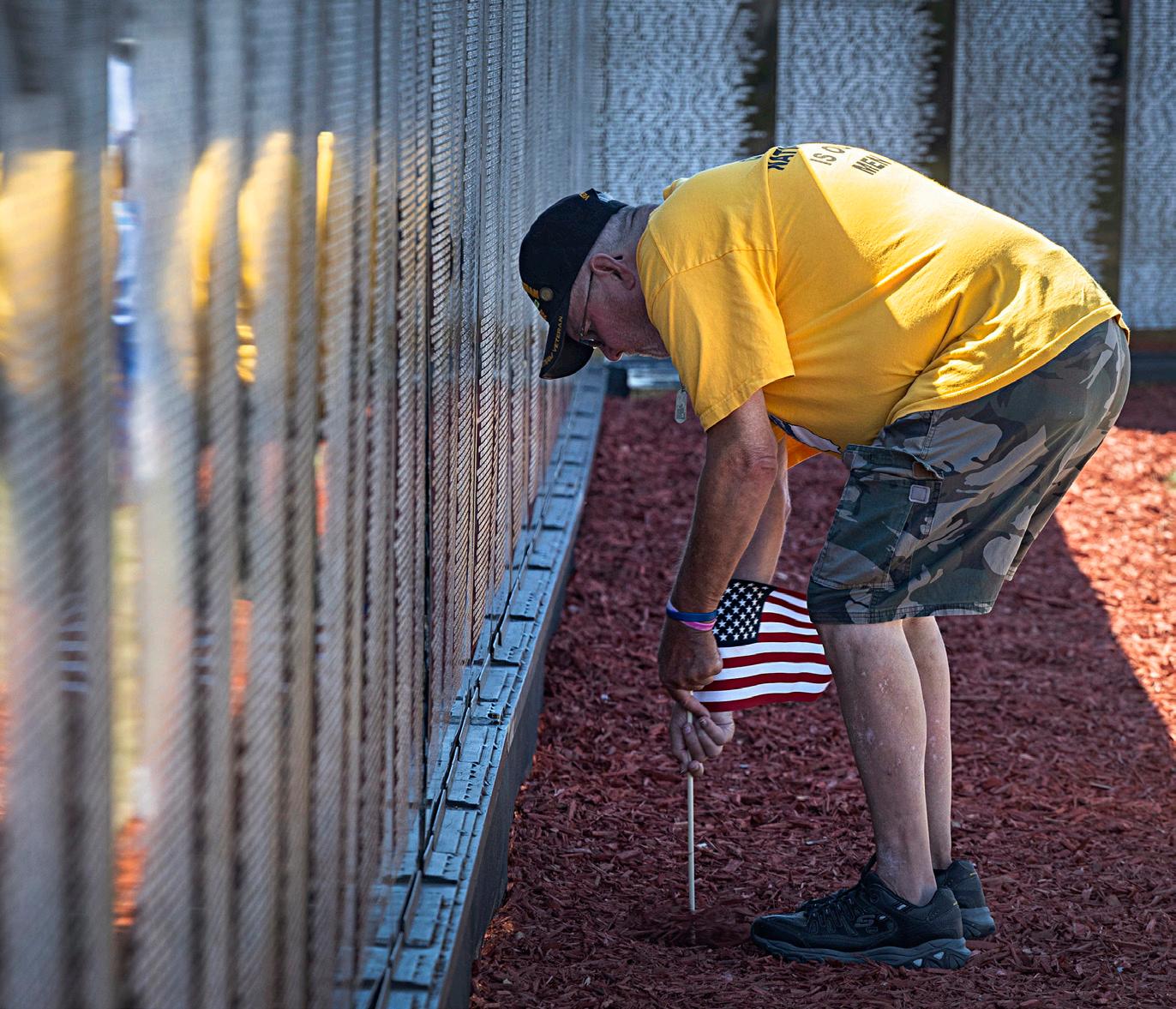 ABOVE: Art Oldham of Tampico plants a flag in front of one of three names of friends Aug. 31 at the Vietnam Traveling Memorial Wall in Rock Falls. Oldham paid respects to friends Ricky Lee Doye, John Fordham and Jerry Celletti, who are all from the area . LEFT: Navy veteran Jeff Dever of Prophetstown places a flag on his chair Aug. 31 as he waits for the Vietnam Traveling Memorial Wall to arrive in Rock Falls.