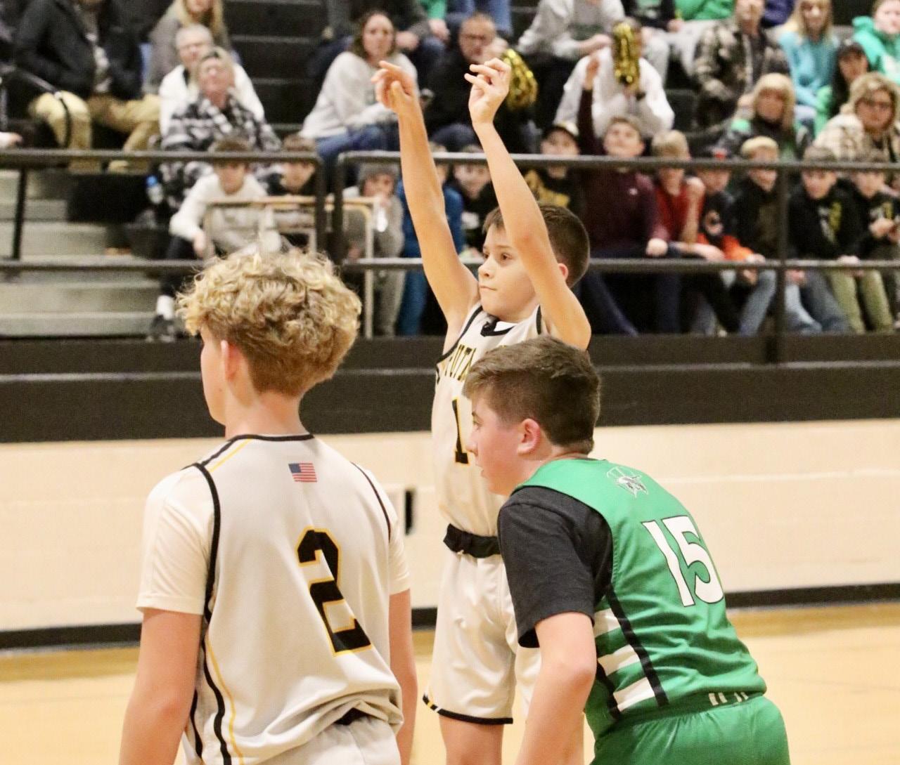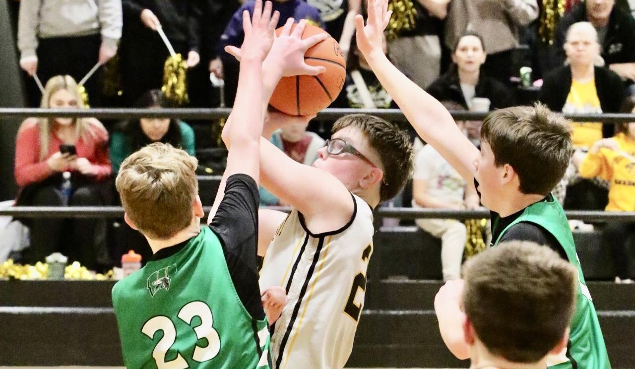Photos provided by Shannon Jenkins TOP: Putnam County Junior High defeated Wethersfield 47-32 in the championship game of its own IESA Class 2A regional on Thursday. The top-seeded Pumas beat Bureau Valley 39-6 in the semifinals. Next up, the Pumas will play host Indian Creek at 6 p.m. Monday for the sectional championship in Waterman. Team members are (front row, from left) are Jacob Bori, Mylo Myrtle, Sean, King, Hanz Frund and Liam Judd; and (back row) Coach Mike Bori, Jace Newsome, Wyatt Rue, Mason King, Hudson Heiberger, Marshall Holocker, Liam Askland and Coach Tj Askland. Cheerleaders are Eden Johnson, Harper Heuser, Stella Guisti, Arya King, Sophia Lozano, Colette Gapinski, Reagan Doehling, Penelope Bird, Savannah Grasser, EliMae Glynn, Izzy Bartoluzzi and Addilyn Podobinski. ABOVE: PC’s Liam Judd toes the line for the free throws in Thursday’s regional finals in McNabb. RIGHT: PC’s Marshall Holocker gets through traffic for a basket in Thursday’s regional finals in McNabb.