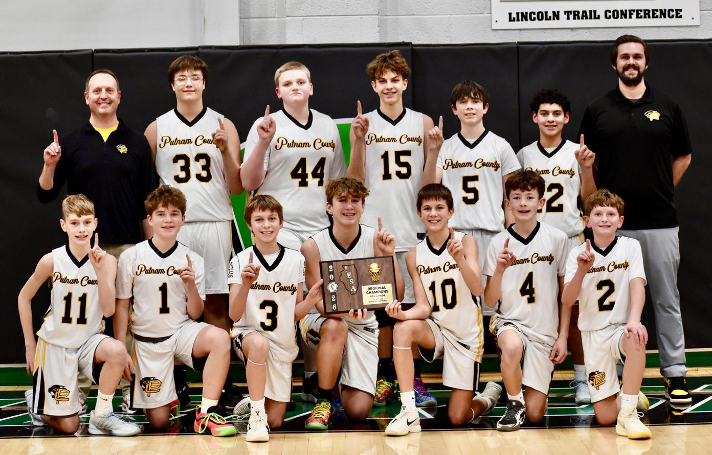 Putnam County defeated Kewanee Wethersfield 38-33 to capture the IESA 2A 8th grade regional championship in Kewanee on Thursday, Jan. 29. Team members are (front row, from left) Calvin Fiedler, Anthony Popurella, Cayden Bush, Luke Gabrielse, Hayden Doyle, Garrett Billups and Davis Carlson; and (back row) Coach Brett Carlson, Eli Pennell, Brendan Linton, Nolan Weddell, Camden Moriarty , Geoffrey Pagani and Coach TJ Askeland.