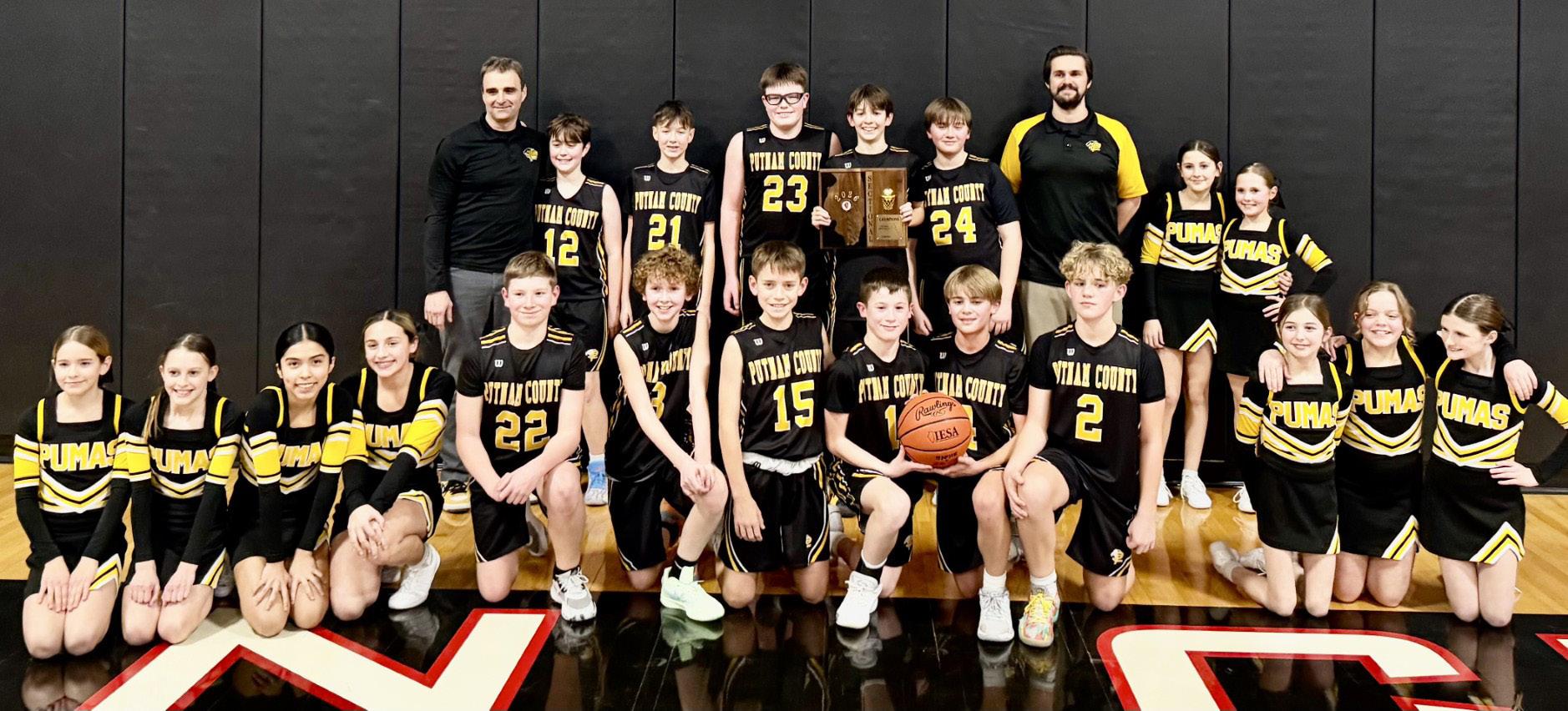 Putnam County defeated host Indian Creek 57-21 to capture the Waterman Sectional seventh grade championship on Monday night. The Pumas (24-1) will face Normal Epiphany at 2:30 p.m. Saturday in the 2A state quarterfinals at Macon Meridian High School. Team members are (front row, from left) Jace Newsome, Mylo Mertel, Liam Judd, Hans Frund, Sean King and Liam Askeland; and (back row) Mike Borri, Jacob Borri, Wyatt Rue, Marshall Holocker, Hudson Heiberger, Mason King and TJ Askeland. Cheerleaders are Reagan Doehling, Anya King, Sophia Lozano, Addilyn Podobinski, Harper Heuser, Penelope Bird, Eden Johnson, Collette Gapinski and Stella Guisti.