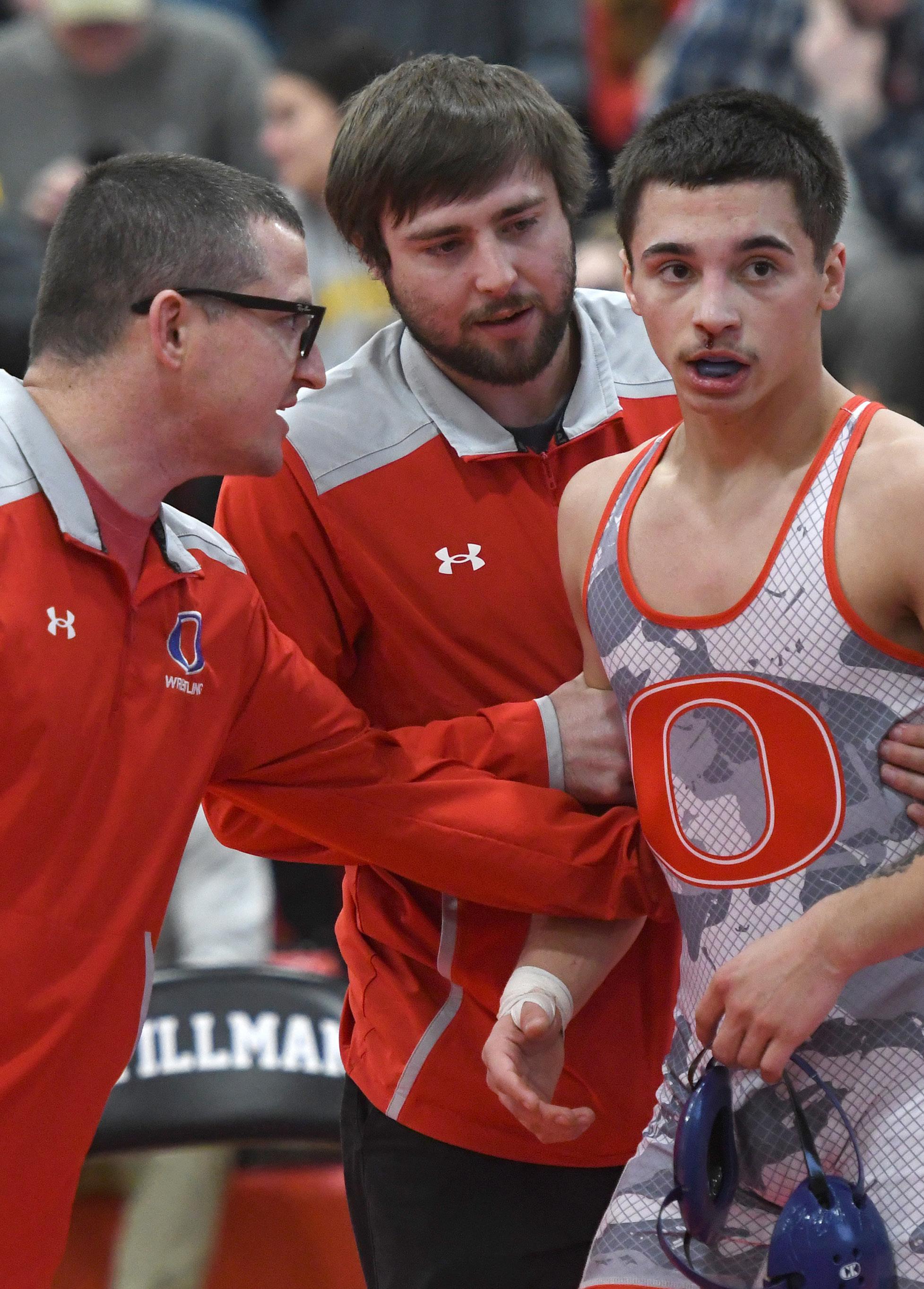Oregon coaches Justin Laham and Noah Paul talk to Josiah Perez after he won a decision over Lena-Winslow’s Keller Otto in the 120-pound championship match on Saturday, Jan. 31, at the 1A Stillman Valley Sectional at Stillman Valley High School.