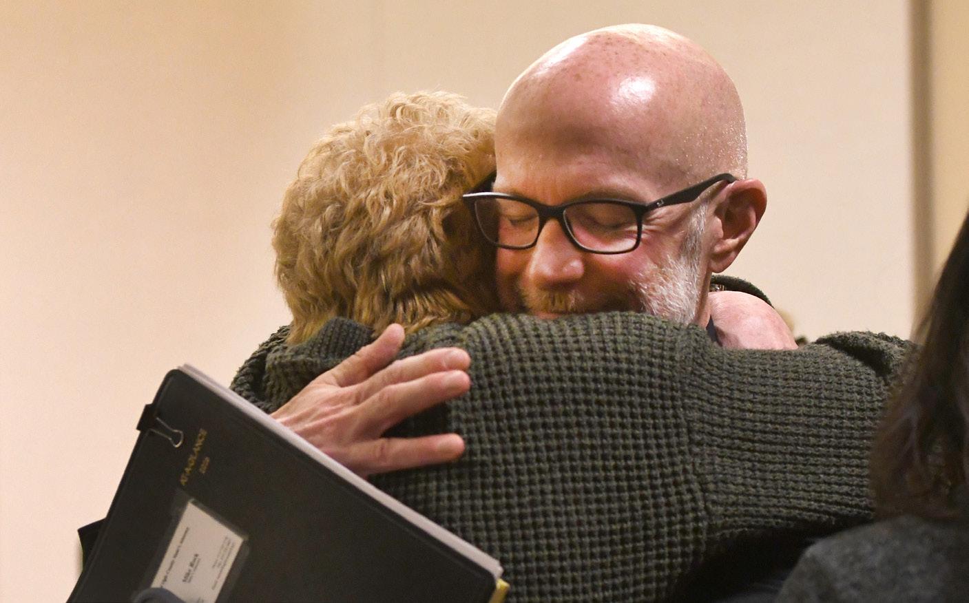 Ogle County State’s Attorney Mike Rock hugs Luann Rosko of Mt. Morris on Thursday, Jan. 29, after jurors found Duane “DC” Meyer guilty of murdering her daughter, Maggie, 31, and her grandson, Amos, 3, in 2016.