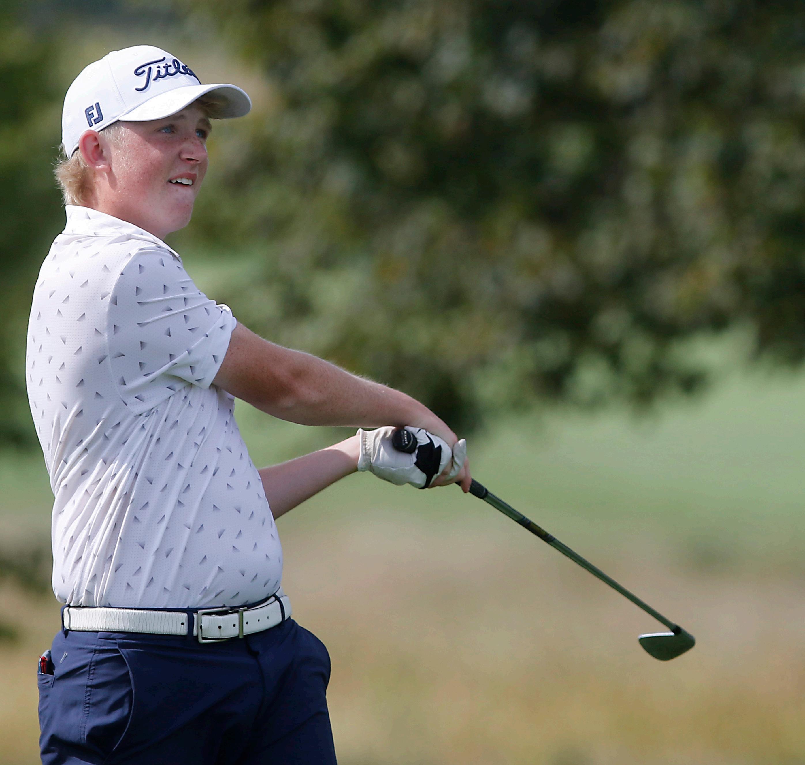 Rochelle’s Ian Metzger watches his tee shot on the ninth hole during the IHSA Class 2A Crystal Lake South Boys Golf Regional on Wednesday, Oct. 1, at RedTail Golf Club in Lakewood. He shot a 72 and earned medalist honors.