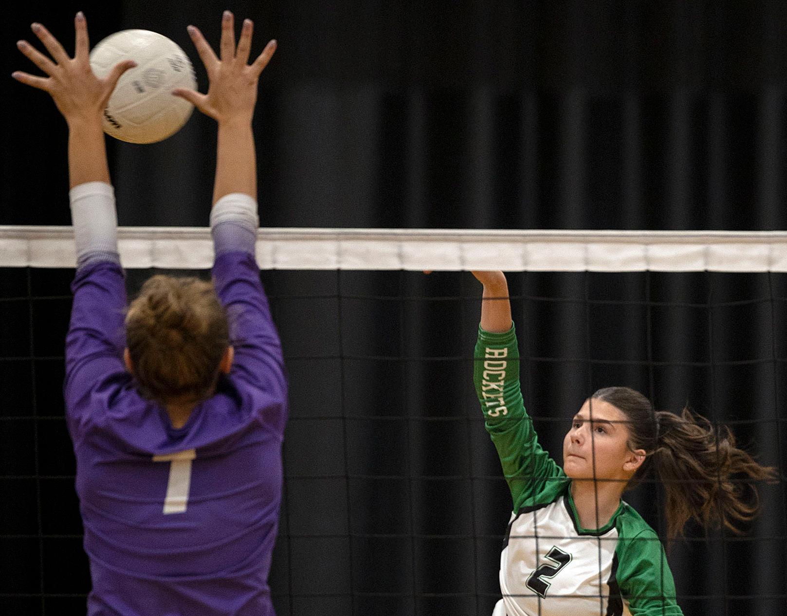 through on a spike against the Rochelle volleyball team’s defense on Monday, Sept. 29, in a nonconference match. Rock Falls won 28-26, 25-17. Rochelle saw its record fall to 11-11 record this season with the set back.