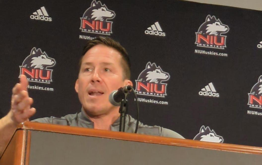 Wrestling coach Ryan Ludwig speaks at NIU’s media day for winter sports last year.