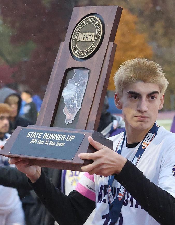 Scott Anderson Mendota’s Johan Cortez poses with the Class 1A State runner-up trophy on Saturday, Nov. 8, 2025 at Hoffman Estates High School.
