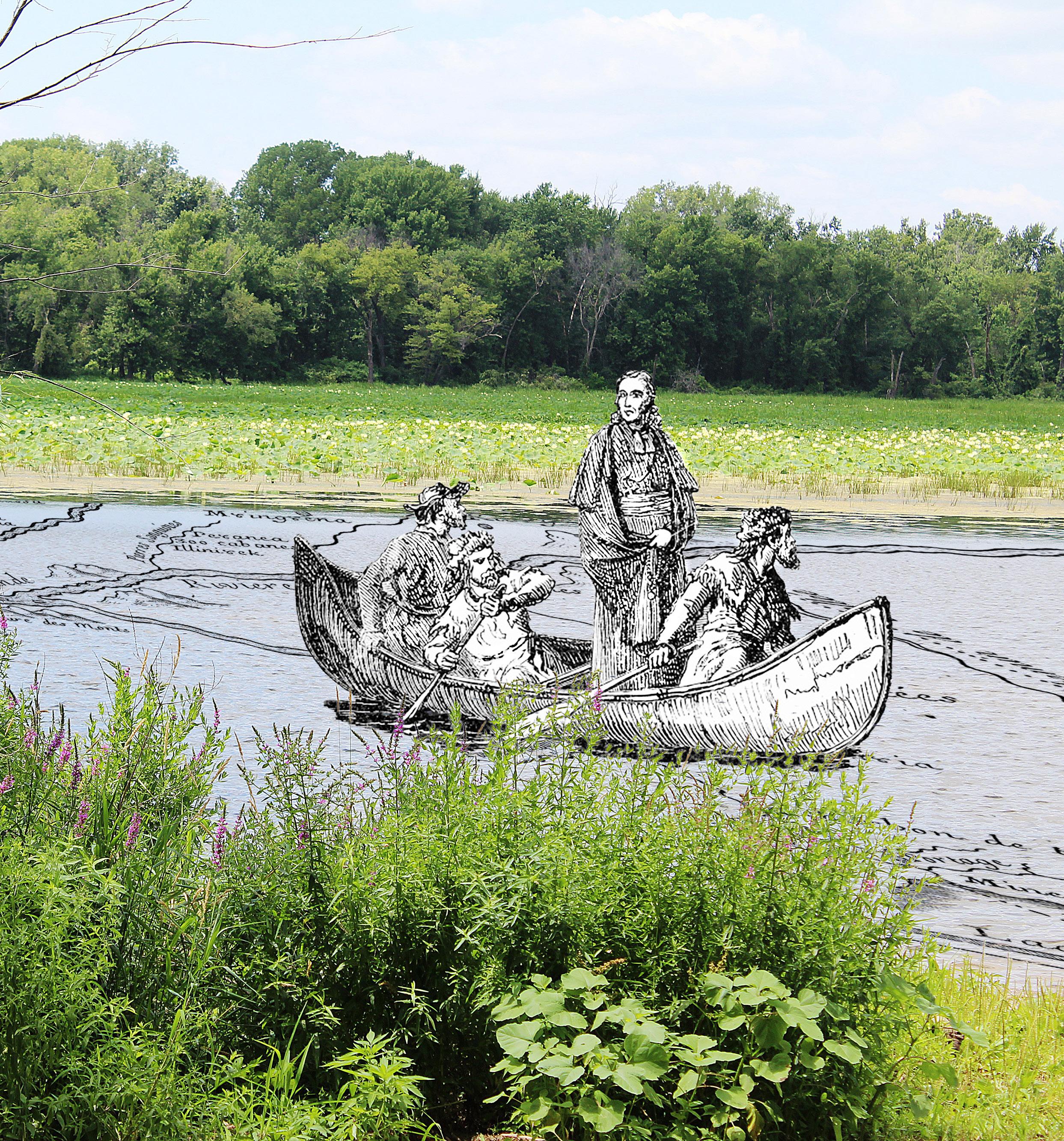 In 1673, new faces were seen in Illiniwek territory, heading down the river — lighter skinned, clothed differently and speaking a language the natives didn’t understand: Frenchmen Jacques Marquette and Louis Jolliet, who had embarked on an expedition along the Mississippi River. They were the first Europeans to descend the Mississippi River from the Great Lakes region to its confluence with the Arkansas River, and they were searching for a passage to the Pacific Ocean.