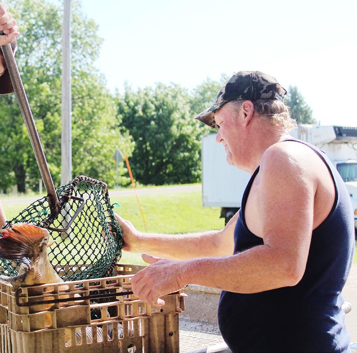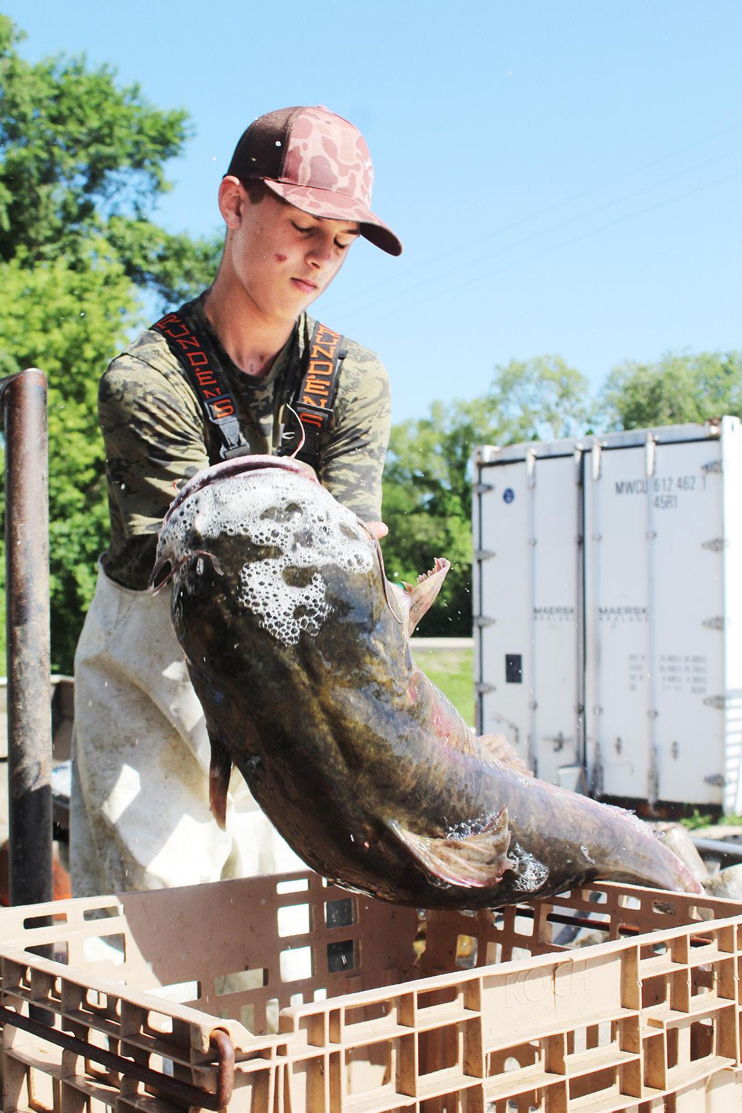 Tristan Schoenhaar (right) of Savanna unloads his catch from a recent day on the water on a boat owned by Terry Theissen (below) of Savanna at Schafer Fisheries in Fulton. The delivery process happens only feet away from where customers can shop for their fish.