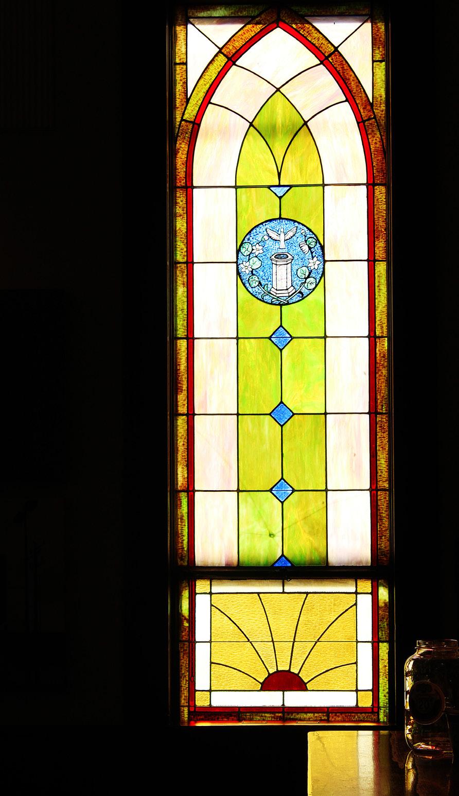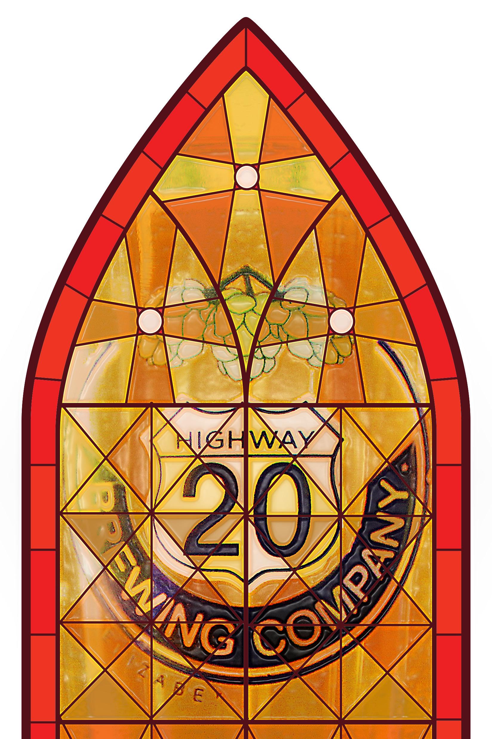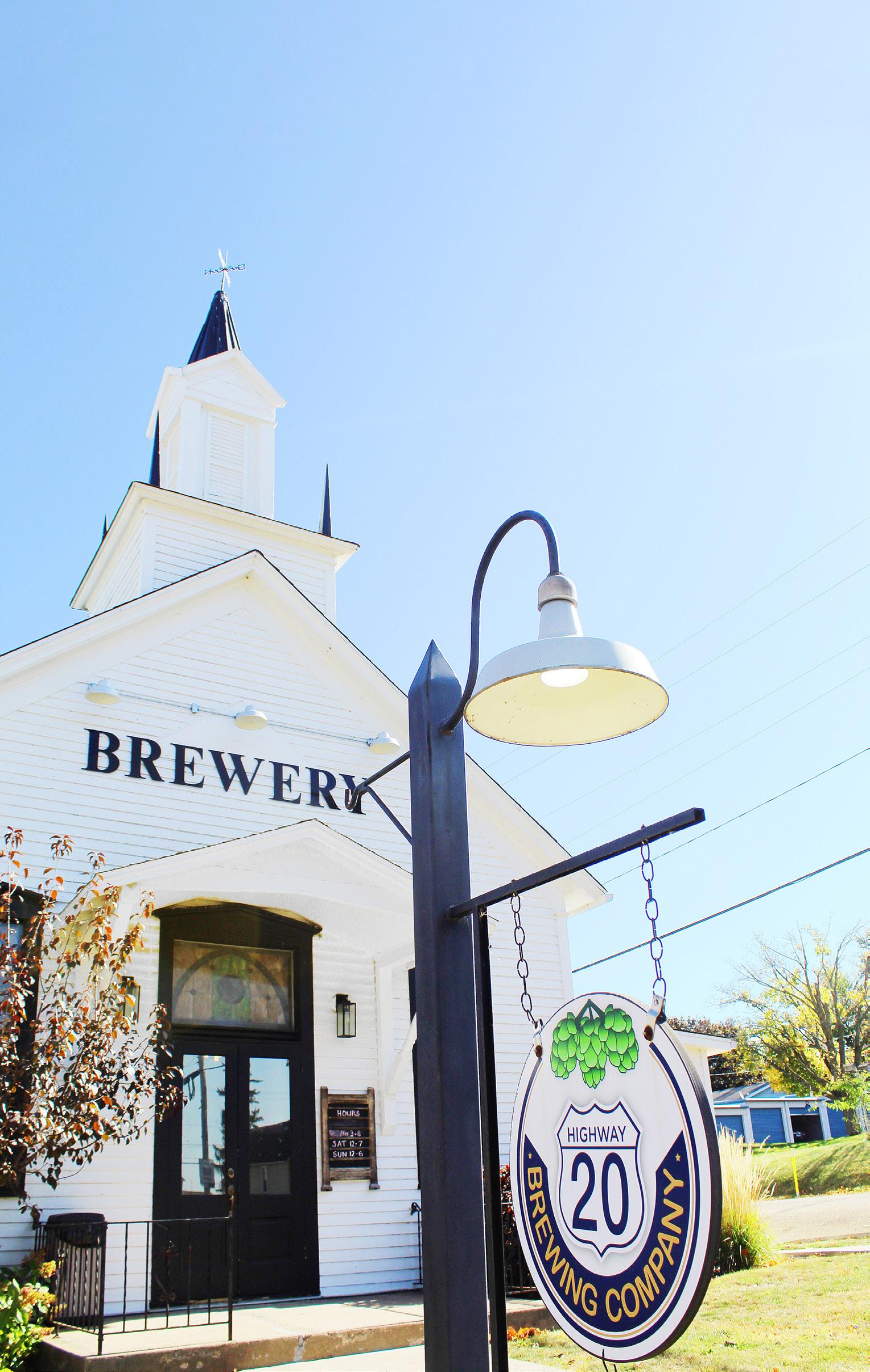 Highway 20 Brewing Company’s cup runneth over with history. It’s located in a former church built in 1875. Though it’s been decades since it served as a church, the stained glass windows remain — and with some of them depicting grains and drinking vessels, it’s almost as if they knew that they’d someday be lighting the way for a brewery, Elsewhere inside, the old sign from the church hangs on the wall (below). At bottom, the church is seen during the 1940s.