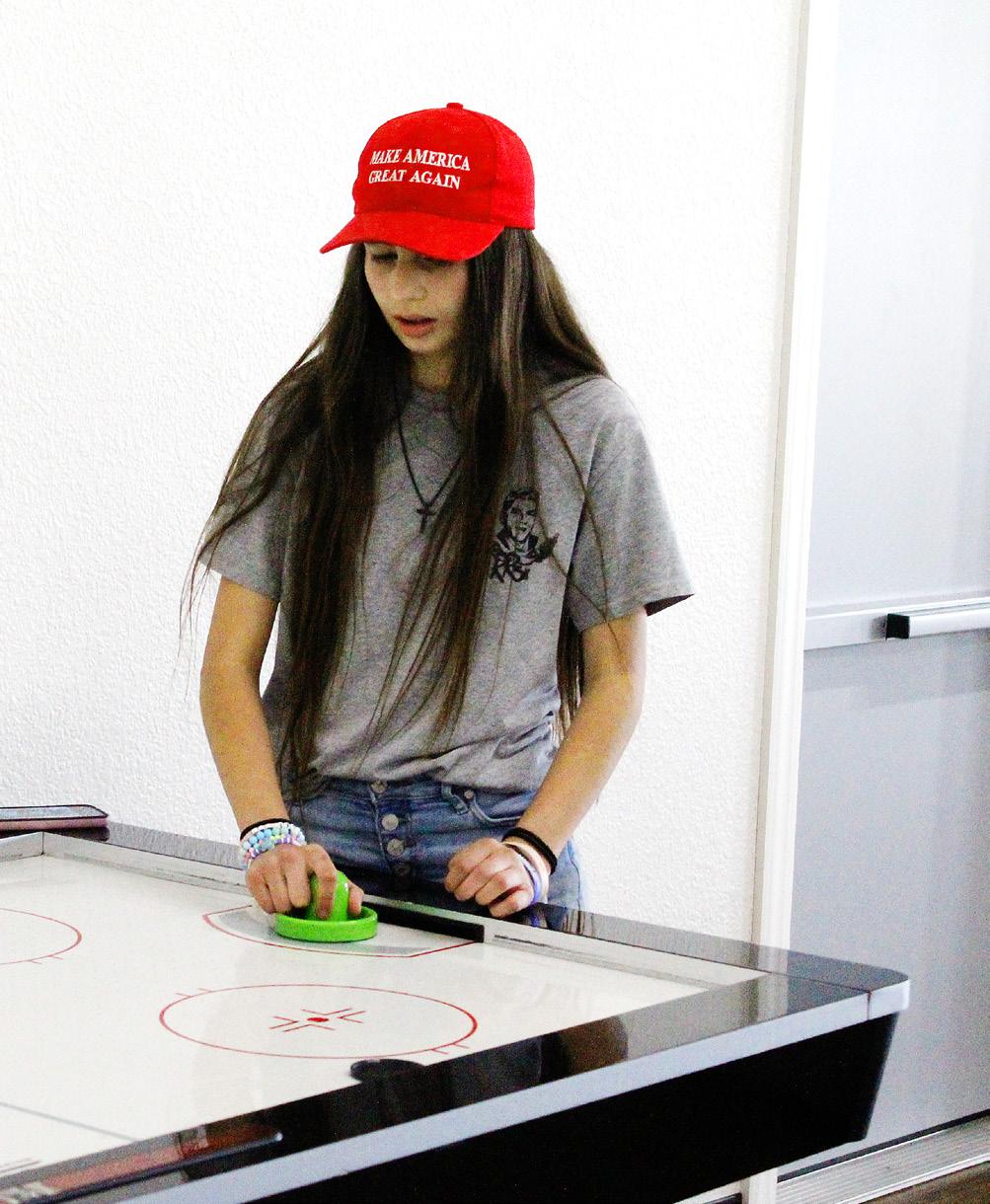 Left: Juliana Martinez tries her hand at air hockey at Elevate Youth Center. Middle: Sophia Gallegos (left) and Kaidin Ranz pick out beads to make bracelets at one of the center’s arts and crafts tables. Below: Brothers Chad and Jeremy Bennett play a video game.