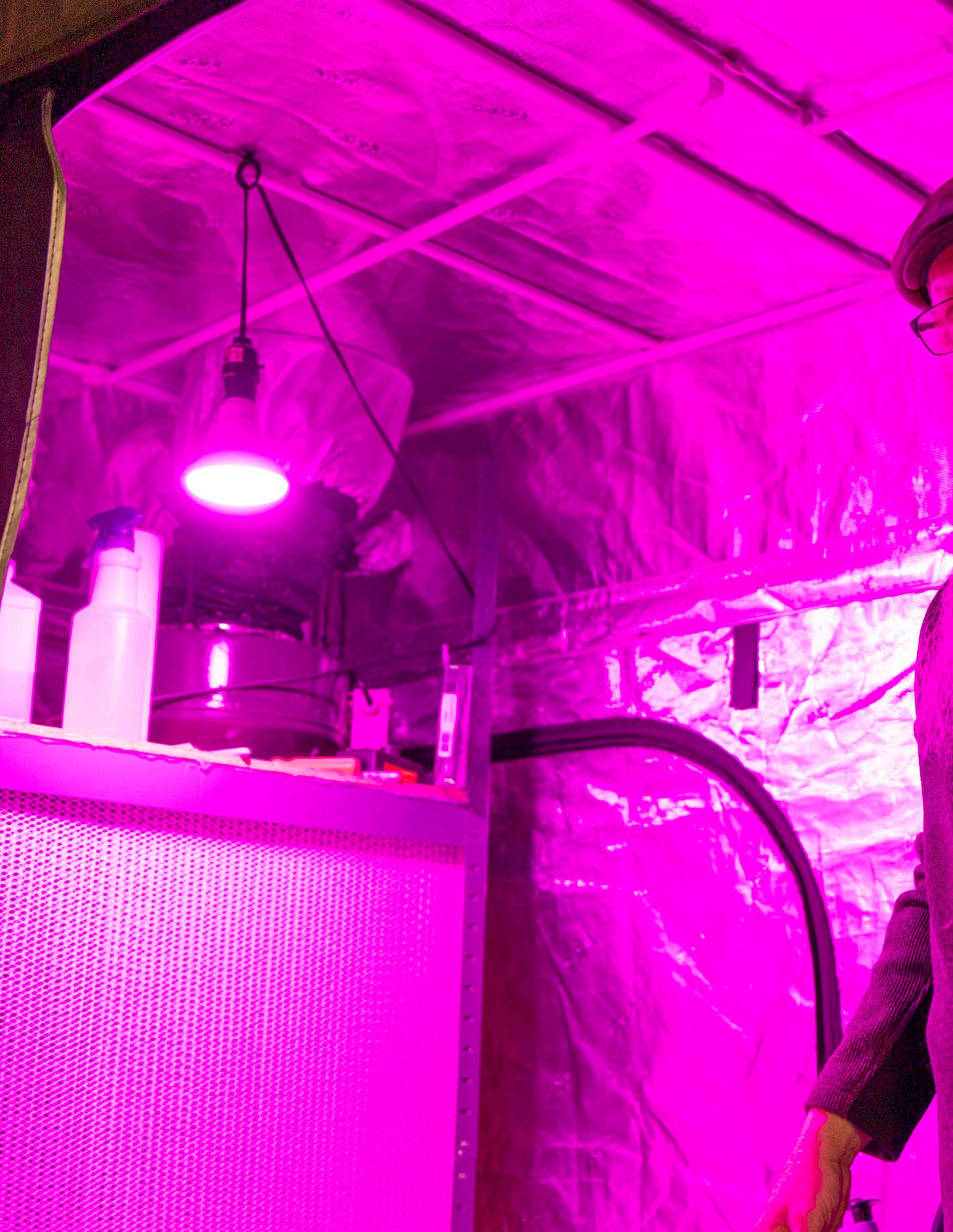 First things first: Thomas will order a mycelium liquid culture from a reputable growing house, which is injected into a nutrient-rich buffet of oats that have been sterilized. The batches are kept in special bags that allow for the flow of gasses. The inoculated grain is moved to a warm incubation room where the white tendrils of the mycelium start to spread throughout. After a few weeks, the grain is broken up and mixed with oak pellets, soybean husks and water and moved to the growing room, a cooler space where the bag is cut open to allow oxygen in and cause the tiny mushroom heads to burst forth.