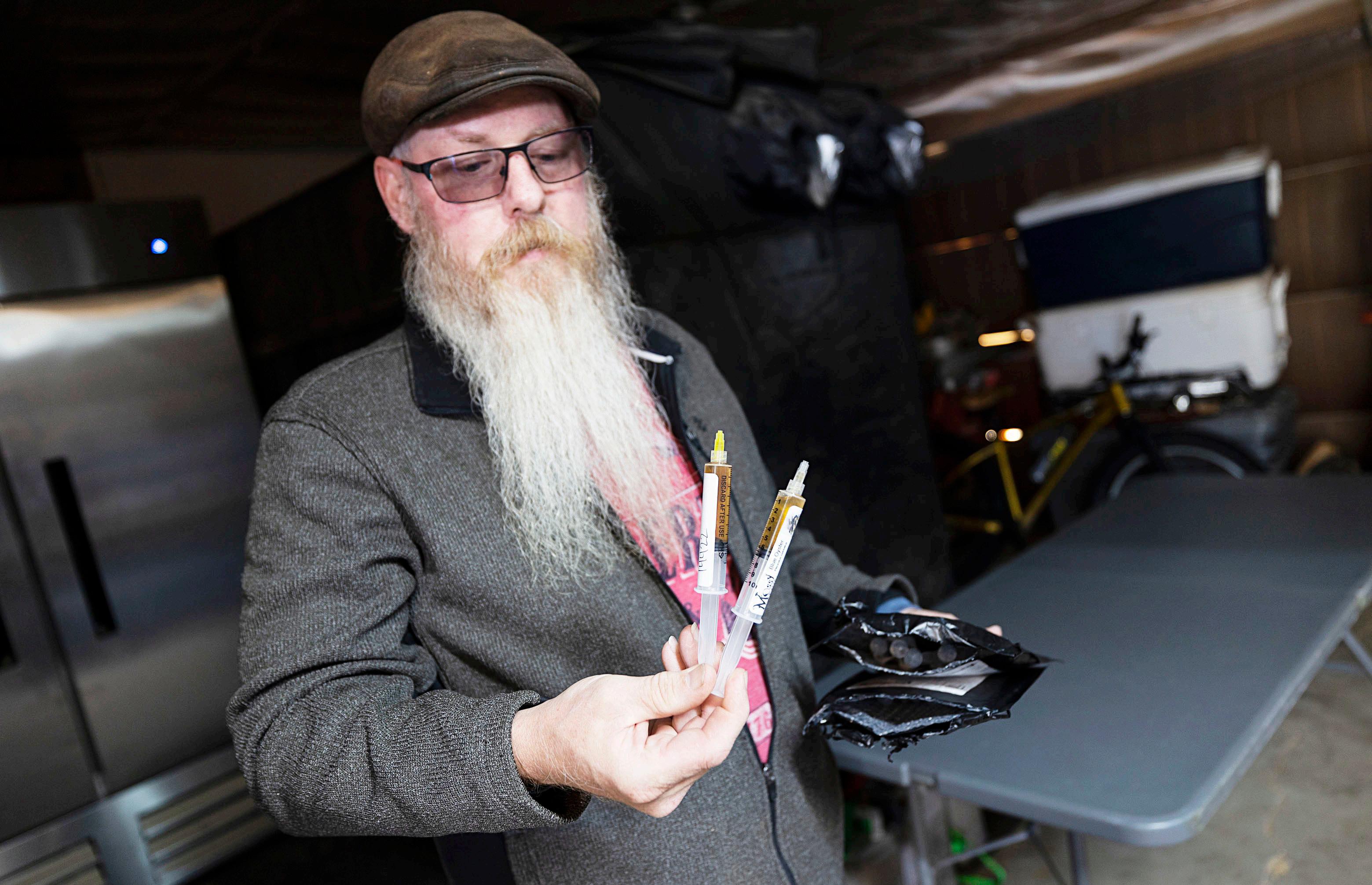 Meddling Sheep Gourmet Mushroom grower William Thomas shows off the liquid culture he will use to start growing a variety of mushrooms at his Amboy home.