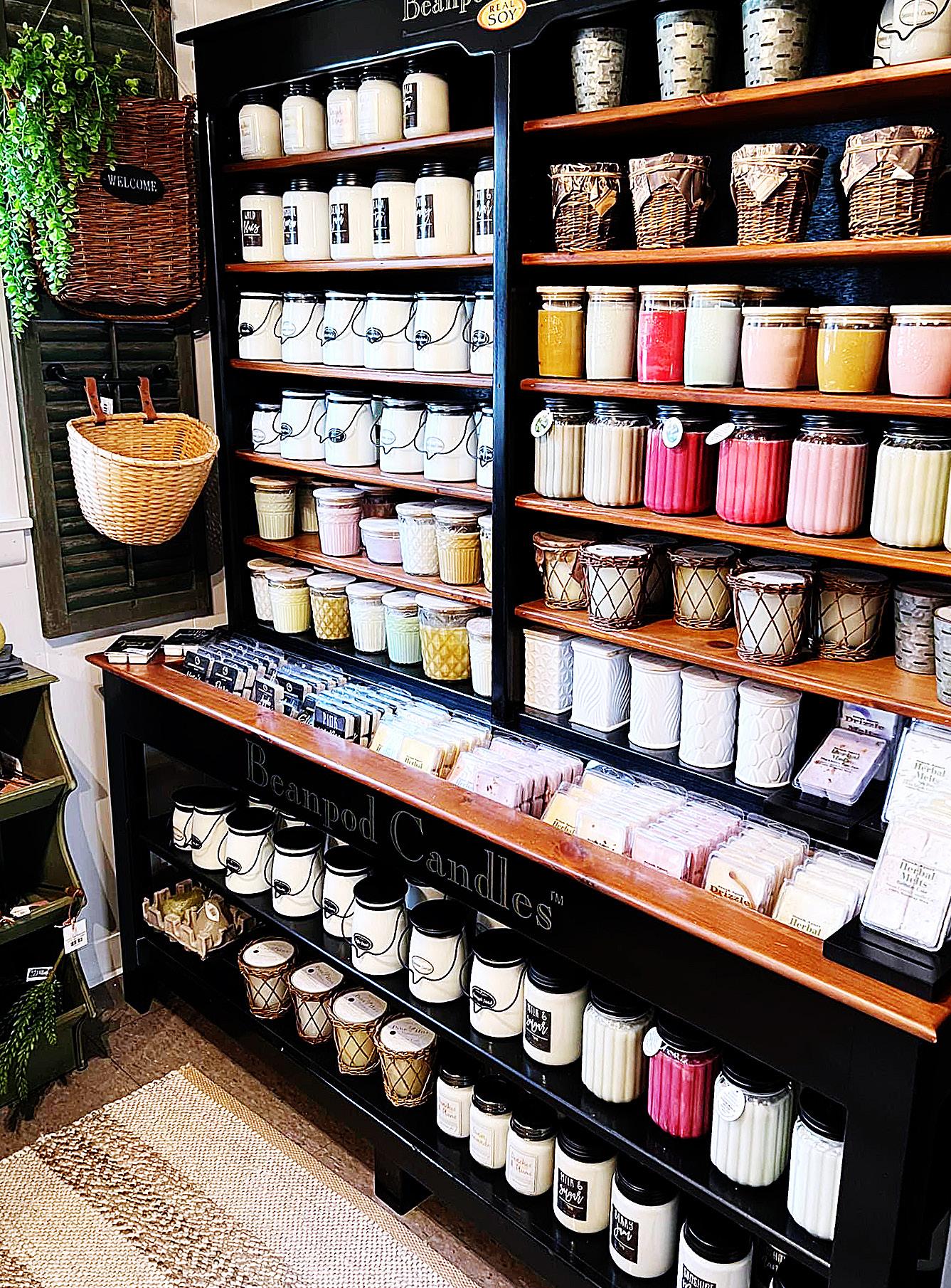 The store’s inventory comes from a variety of vendors. One product that remains constant throughout the year is a wide selection of candles. There’s even a room dedicated to them. Beanpod Candles, made in Mason City, Iowa, are one of the store’s largest candle vendors, and they take up one side of the candle room wall with candles and wax melts in a variety of scents and jars.