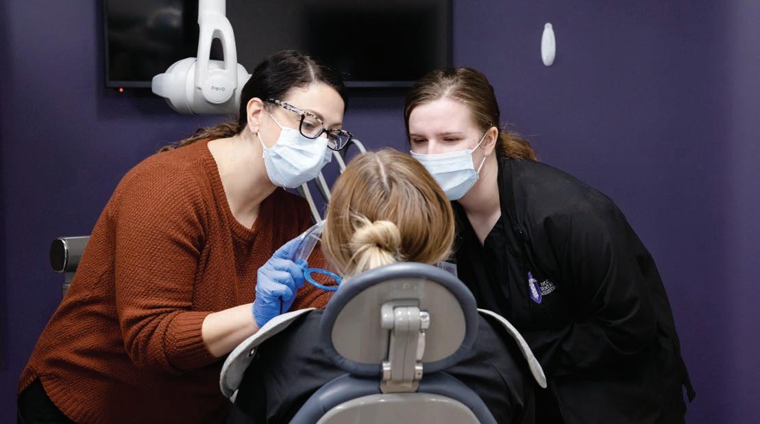 Illinois Valley Community College Dental Hygiene program coordinator Lyndsey Beetz, left, shows student Rebecca Peura how to pl ace the radiography sensor/XCP on another student. They are in the Dental Clinic located within the Building G Dental Health Center. IV CC’s new dental clinic has eight fully functioning operatories in addition to the radiography room that includes a digital panoramic x-r ay unit.