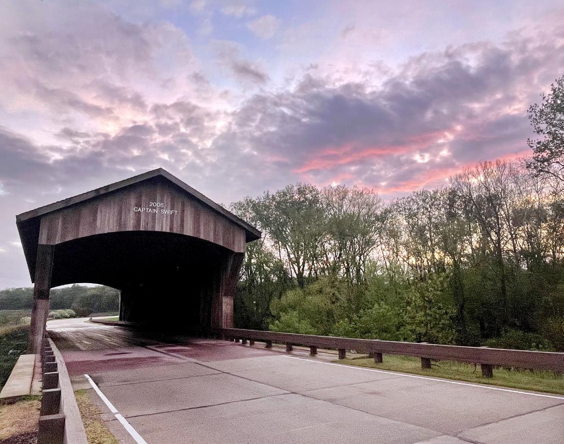 This two-lane covered wooden bridge, built in 2006, is the only one of its kind in Illinois. It is made in the Burr-arch design, an idea patented by Theodore Burr of New York in 1804.