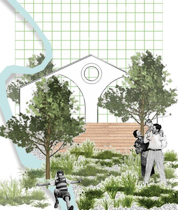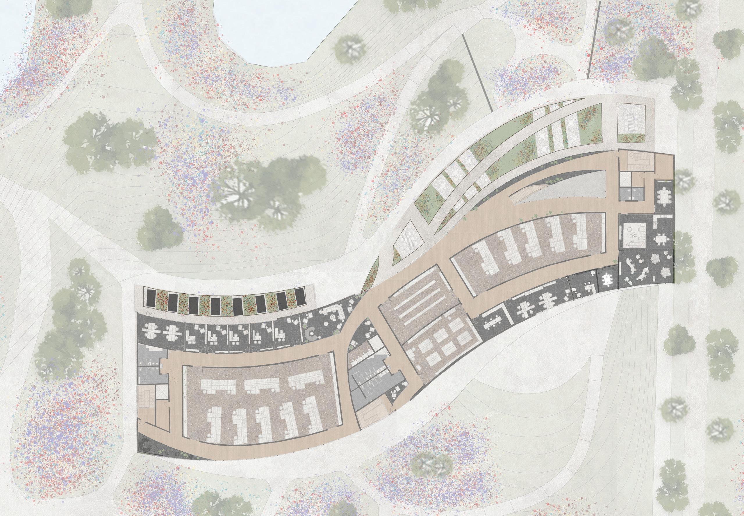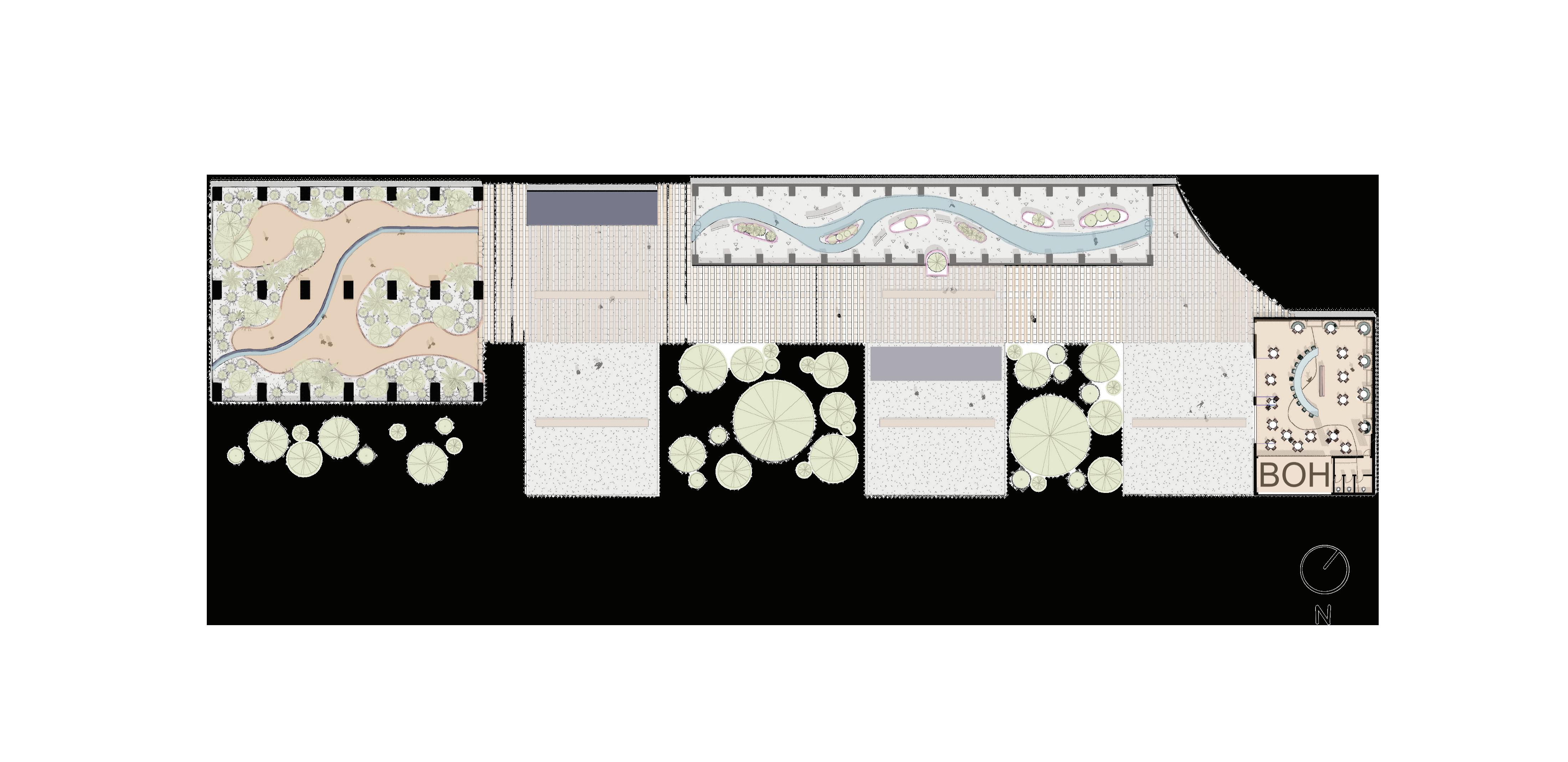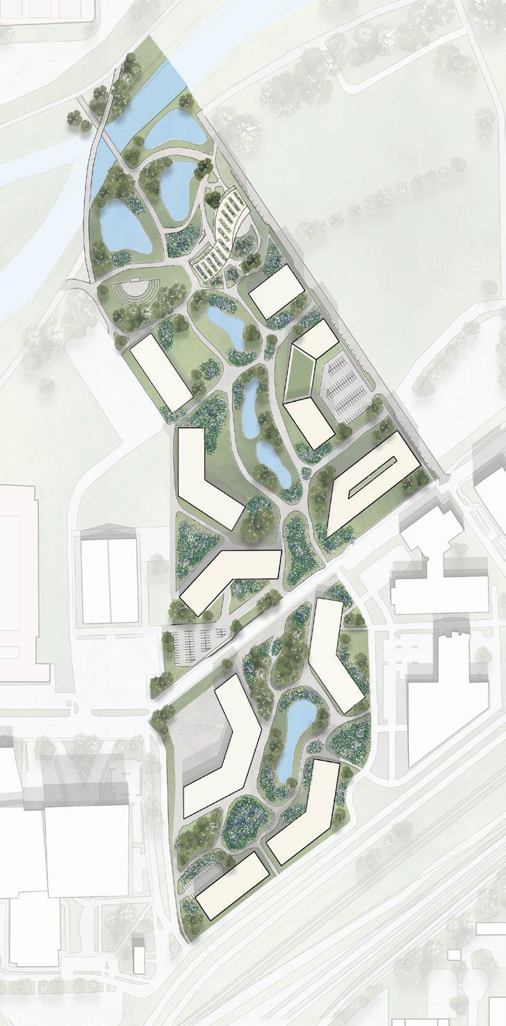 This master site plan illustrates how an economy can thrive when it is thoughtfully activated. By creating purposeful destinations, the design draws people into previously underutilized spaces and fosters a welcoming sense of community. The plan invites individuals of all backgrounds and industries to come together to engage with nature, through recreational use of the paths or through the study of hydrology, encouraging both social connection and environmental awareness.