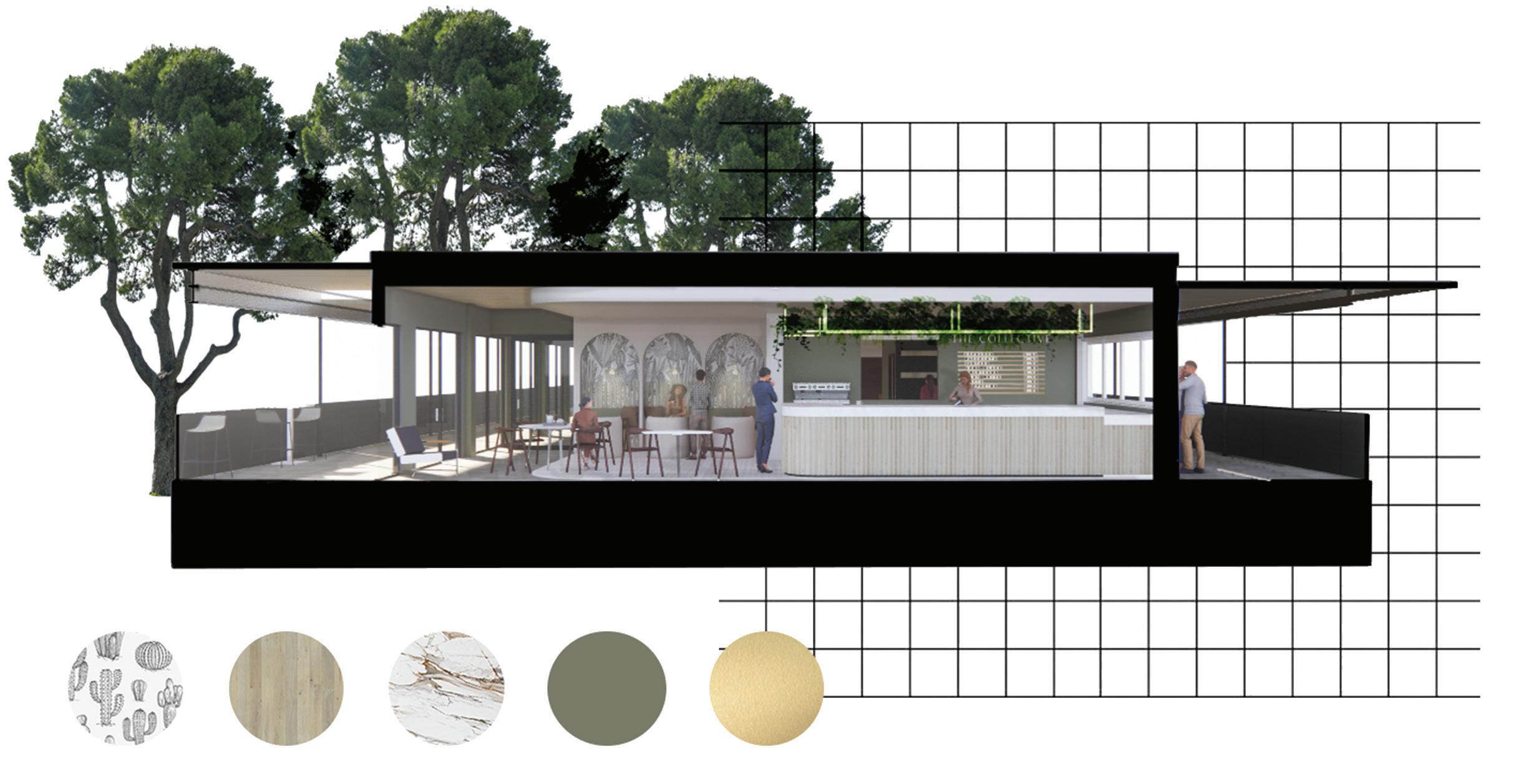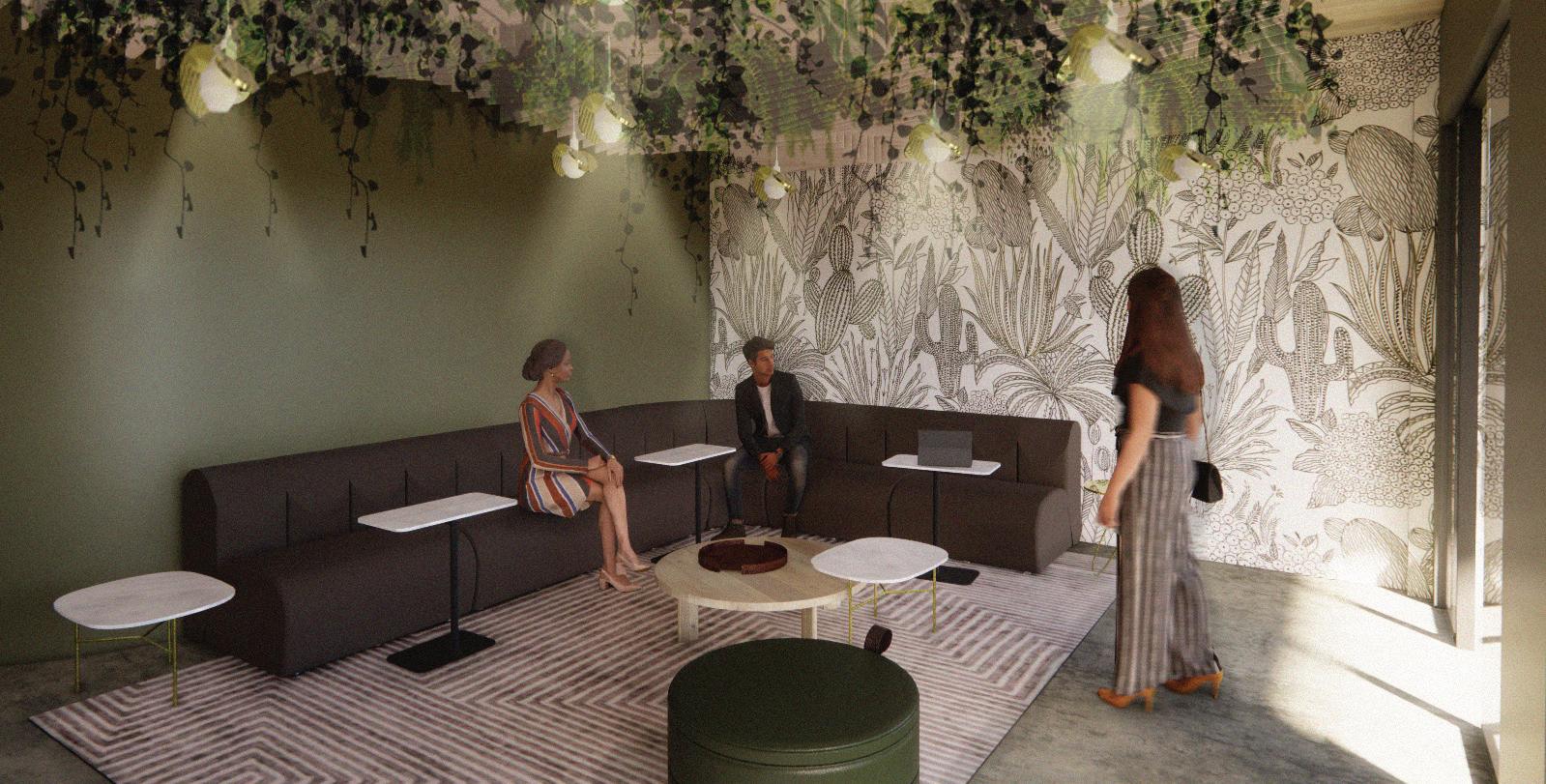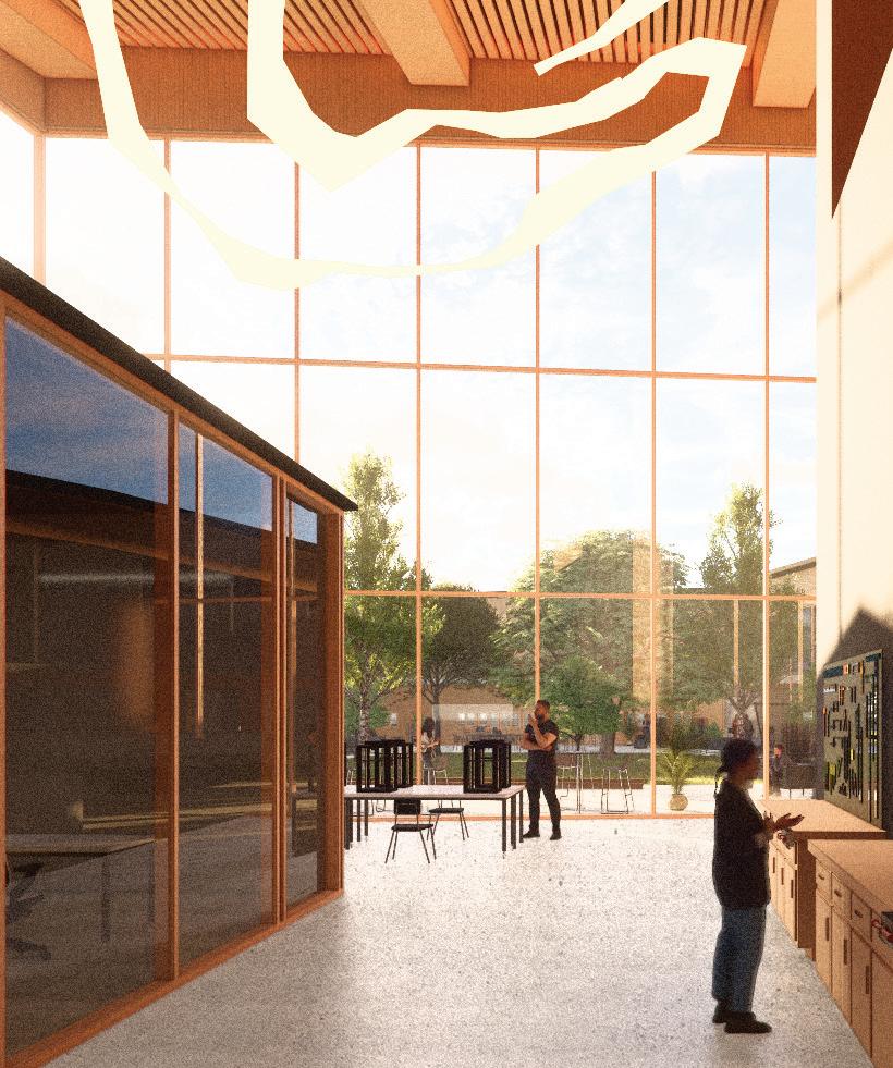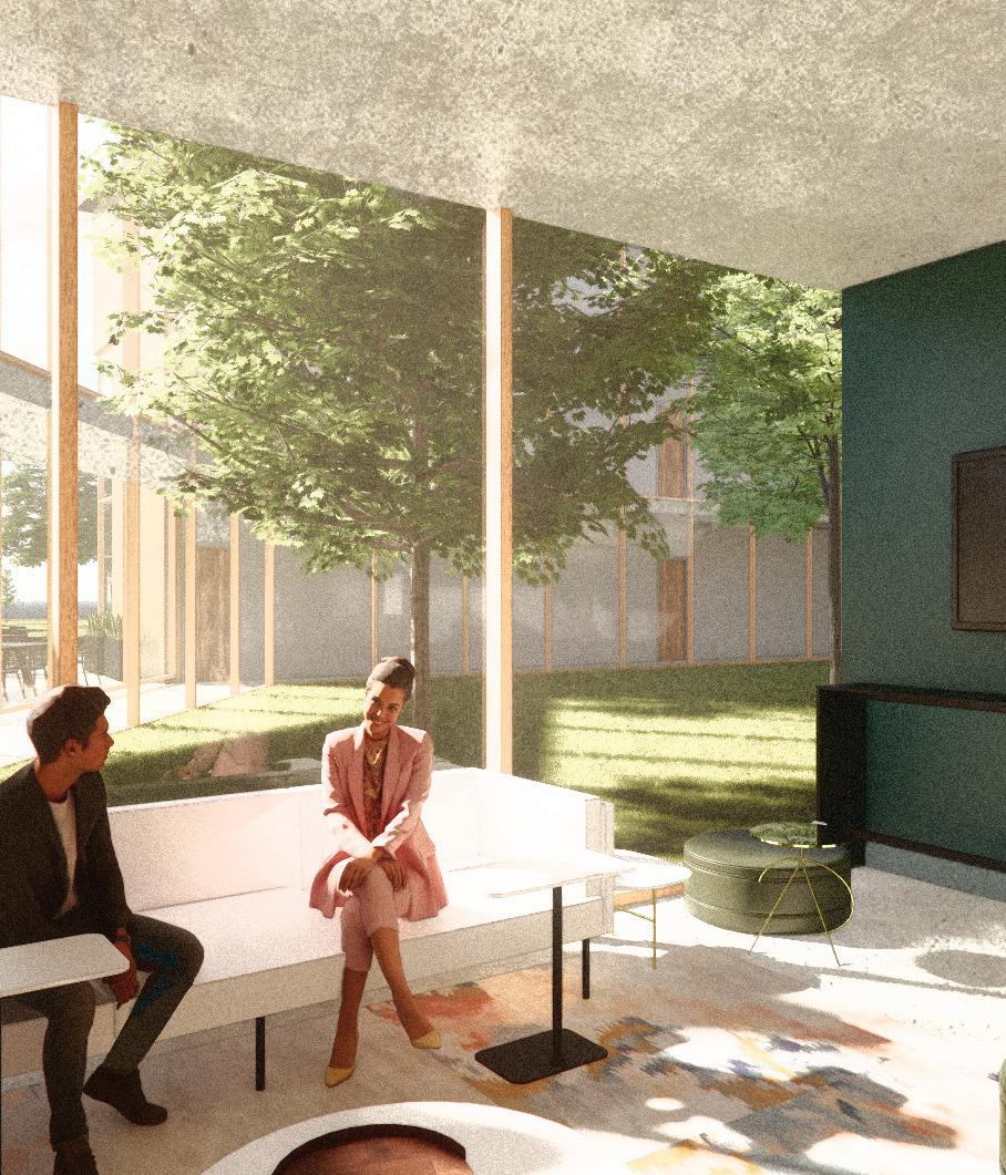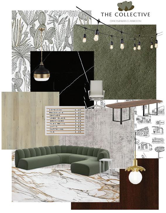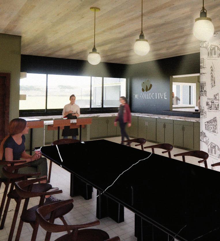 The interior of The Collective is a warm space that plays off of its surrounding nature. With many natural materials and opportunities to interact with nature through the interior and exterior. The Collective also features wallpaper from local artists with inspirational art of Houston itself. With the site being directly across from a school it gives students the chance to share, learn, and connect with their community.