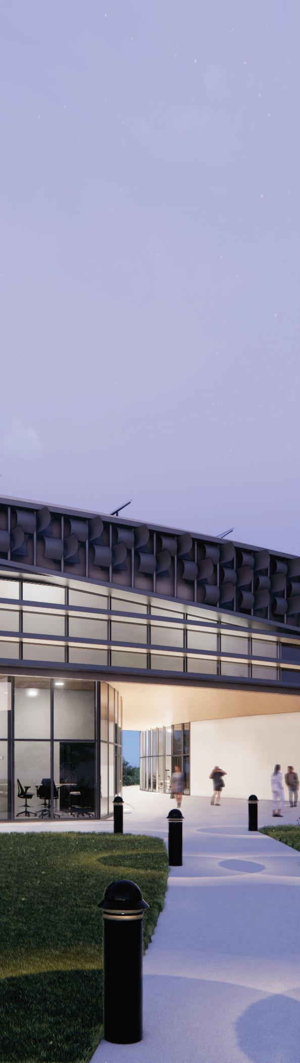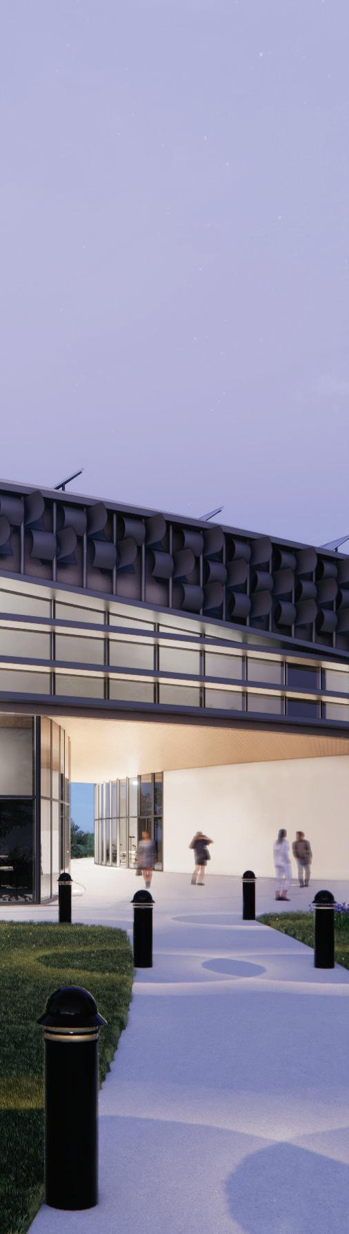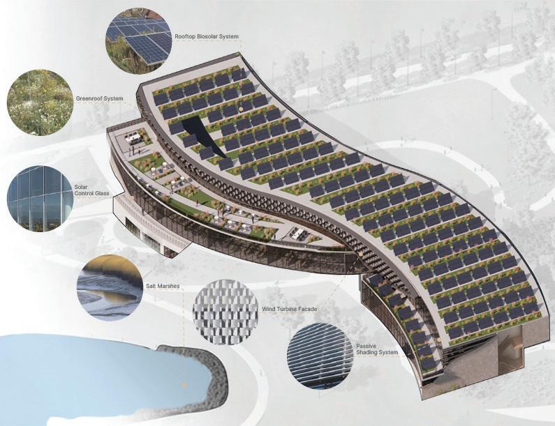 The Oxbow Research Center fosters education, research, and community engagement while strengthening connections to the earth. The ground floor includes a café, study spaces, laboratories, and lecture halls, with classrooms and a library above. Shaped by site conditions, the building responds to sun and wind patterns to maximize natural energy use. Sustainable strategie, such as passive solar fins, a rooftop biosolar system, a wind turbine façade, a green roof, and solar control glass, support a net-zero energy goal and occupant comfort, while on-site bioswales contribute to sustainable water management.