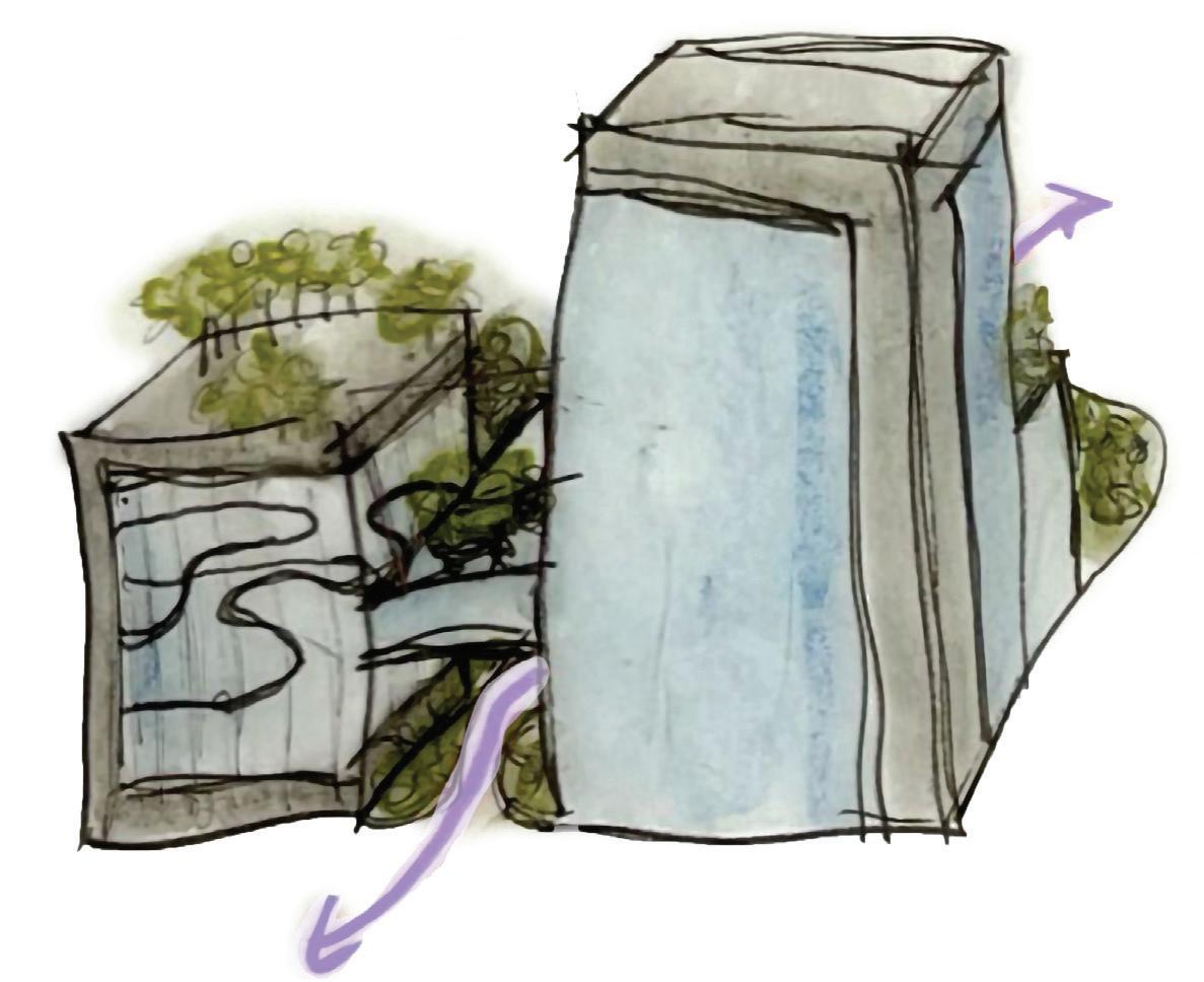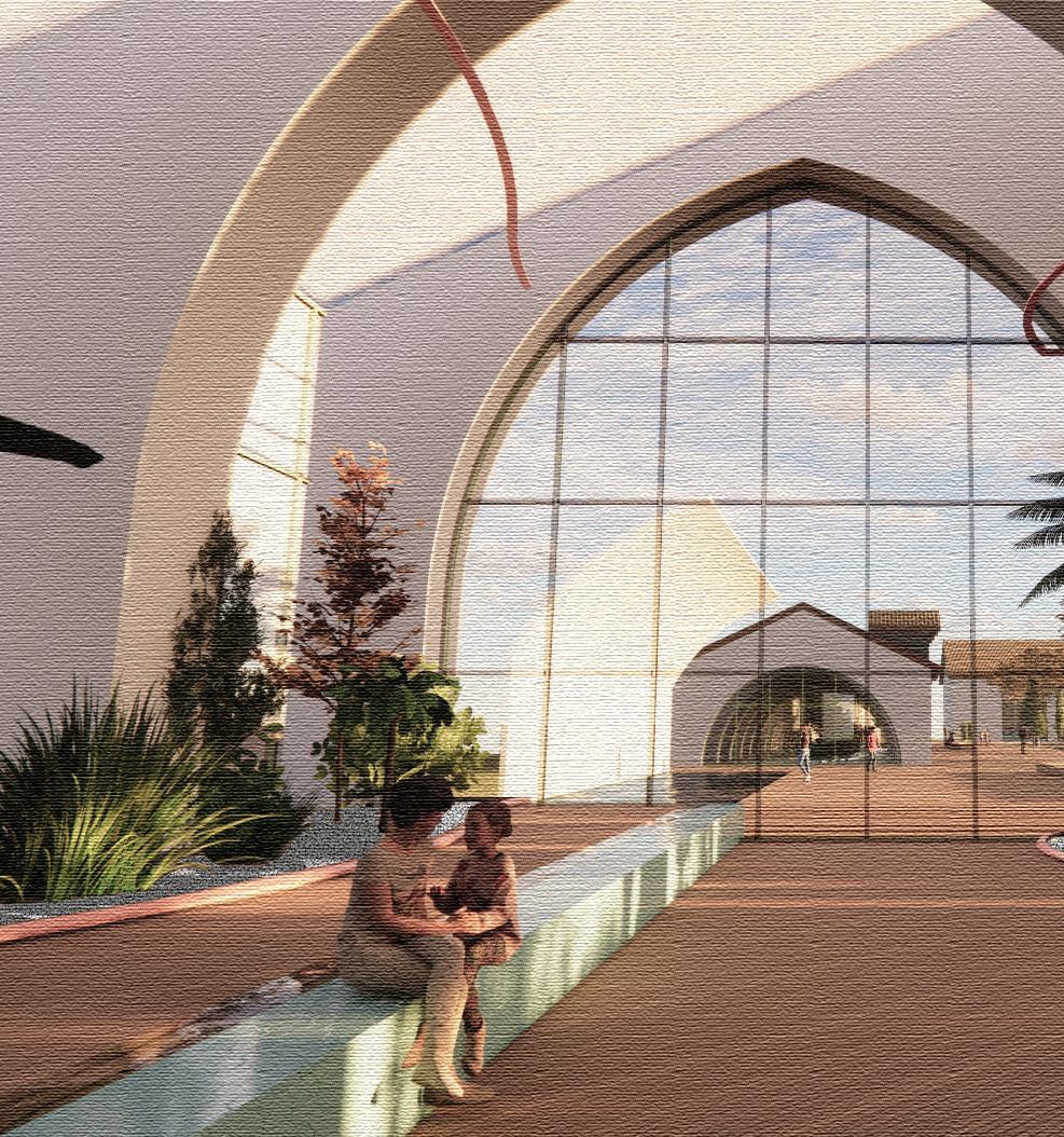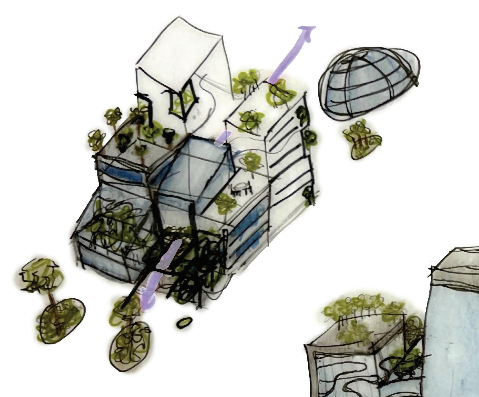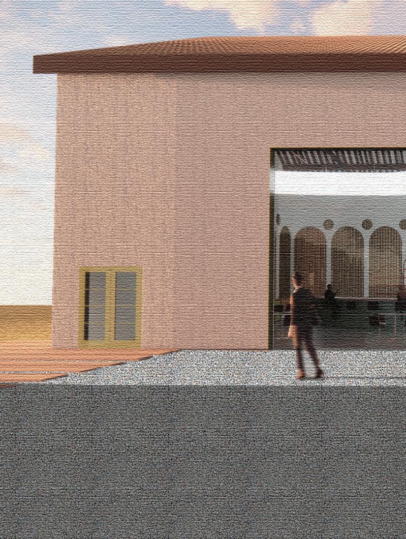 These conceptual sketches explore how the building’s volumes, circulation, and rooftop terraces can be reinterpreted to support cultural gathering, storytelling, and community interaction. Pathways and visual connections, shown with directional flows, guide visitors through layered experiences while integrating green spaces that promote reflection and social engagement. The floor plan translates these ideas into a cohesive layout, balancing interior flexibility with exterior public gathering areas. Together, these strategies reinforce the project’s mission: to transform an existing structure into a dynamic cultural hub where architecture actively cultivates, celebrates, and sustains global traditions.