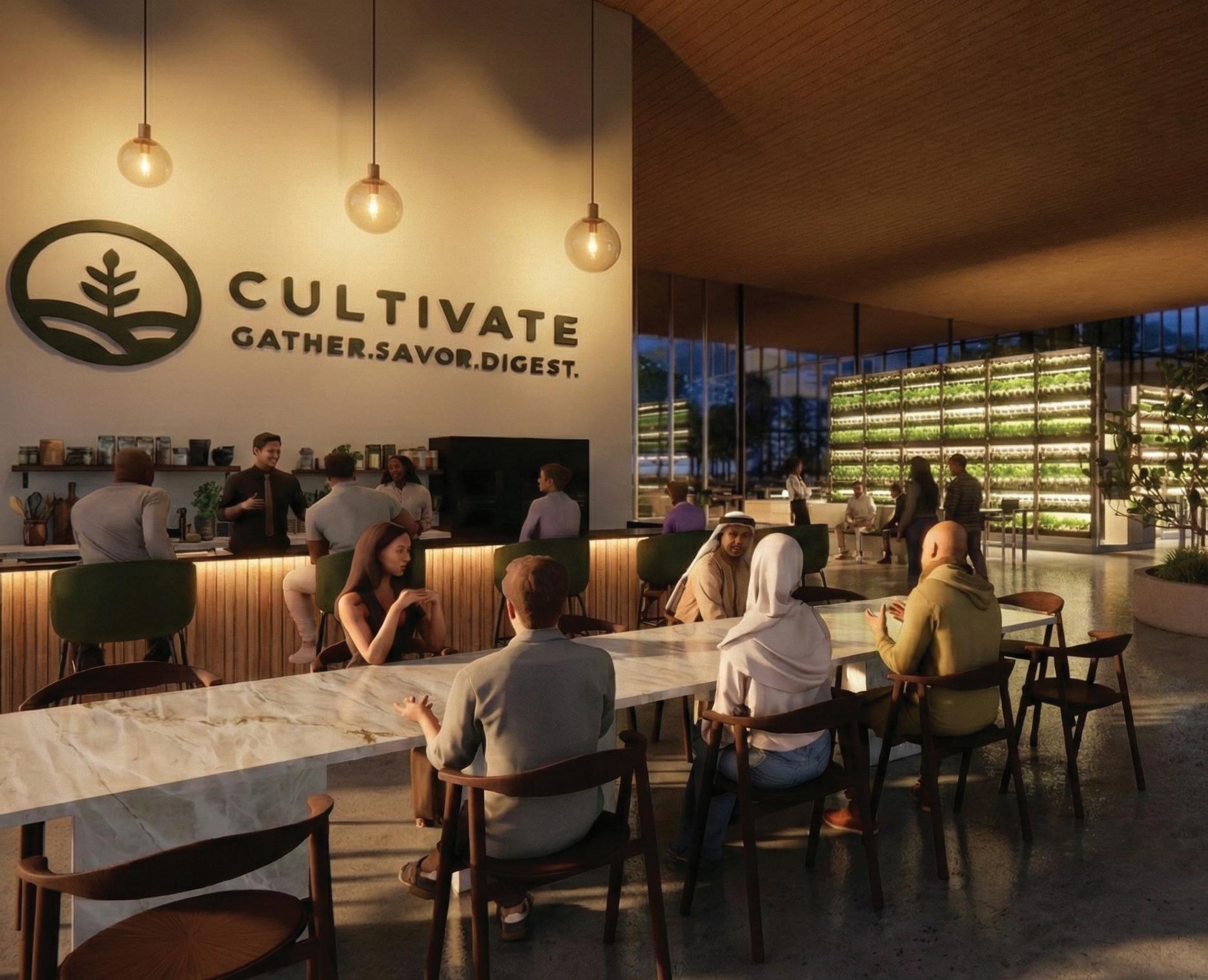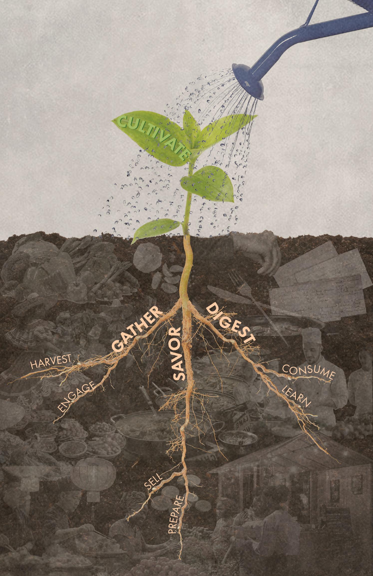 The Cultivate space is designed to welcome people to gather, savor, and digest. Visitors are encouraged to connect with one another while participating in the harvest, cultivating both relationships and fresh produce. They can savor the experience by exploring the preparation of the food and engaging with the products for sale. Finally, the community is invited to digest these experiences by enjoying the harvest and learning about the origins of the ingredients and the farming practices that produced them.