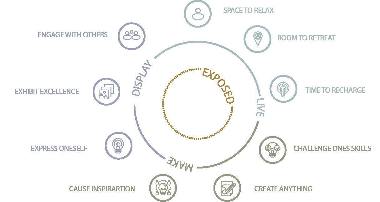 Exposed is a mixed-use space designed to foster community engagement in Wayne, Nebraska, offering a place for people to connect, relax in their own space, and showcase artistic creations. It invites workers, students, and seniors to participate through entrepreneurship, artisan features, and educational classes. The space is not only a hub for creativity but also a platform for personal and professional growth. Exposed inspires a diverse range of users to create and collaborate like never before, providing a vibrant new environment that reflects the historic fairgrounds on which it stands. By merging the past and present, it cultivates a sense of belonging and shared purpose for all members of the community.