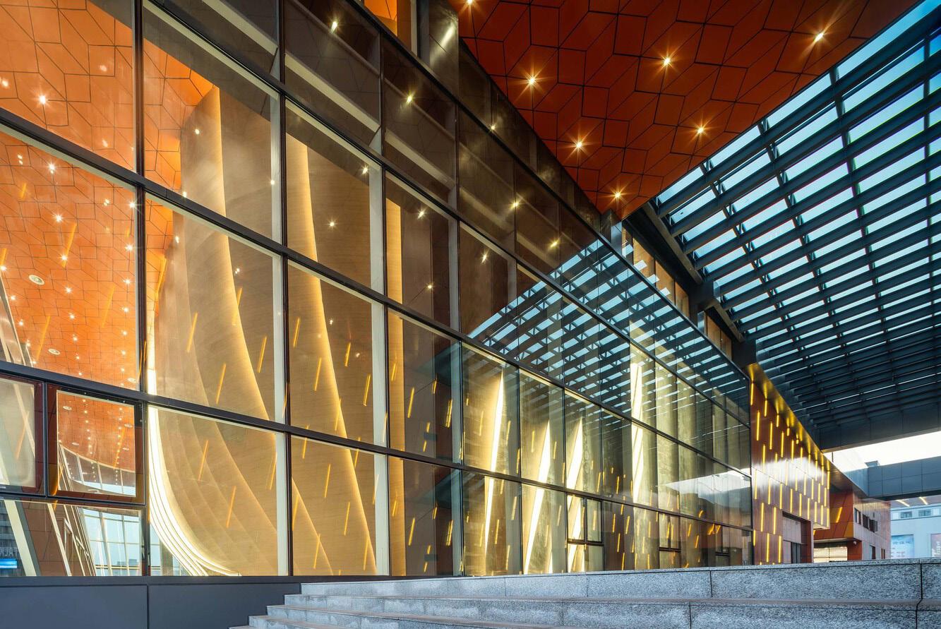In the overall layout, the four main venues are covered in four quadrants by the stretched and unified roof according to their dynamic and static differences. Highlight the area of public space in the gray mass through clear volume culling. The design internalizes the urban street-like experience into the center of the building volume by placing two-story outdoor public streets, circular corridors, sunken landscape courtyards, patios and other operations inside the building. The changeable and warm inner wall, as shown by the cut canyon, integrates the lighting design, presents two kinds of texture atmosphere day and night, and is unified in the momentum of inward dumping. The user displays a protected migration path in the center of the volume and transmits an encouraged link and roaming experience. Unfortunately, the external functionality needs soft decoration and shaping of the landscape, which has not been fully realized due to the partial demolition and reconstruction of local works.