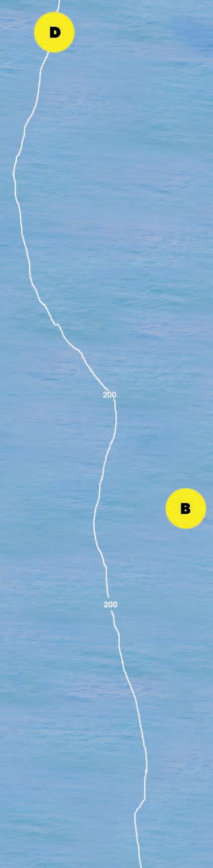 D.When we’re targeting tuna,we move between the areas marked B and D,staying in the warmer water around the 200m contour.