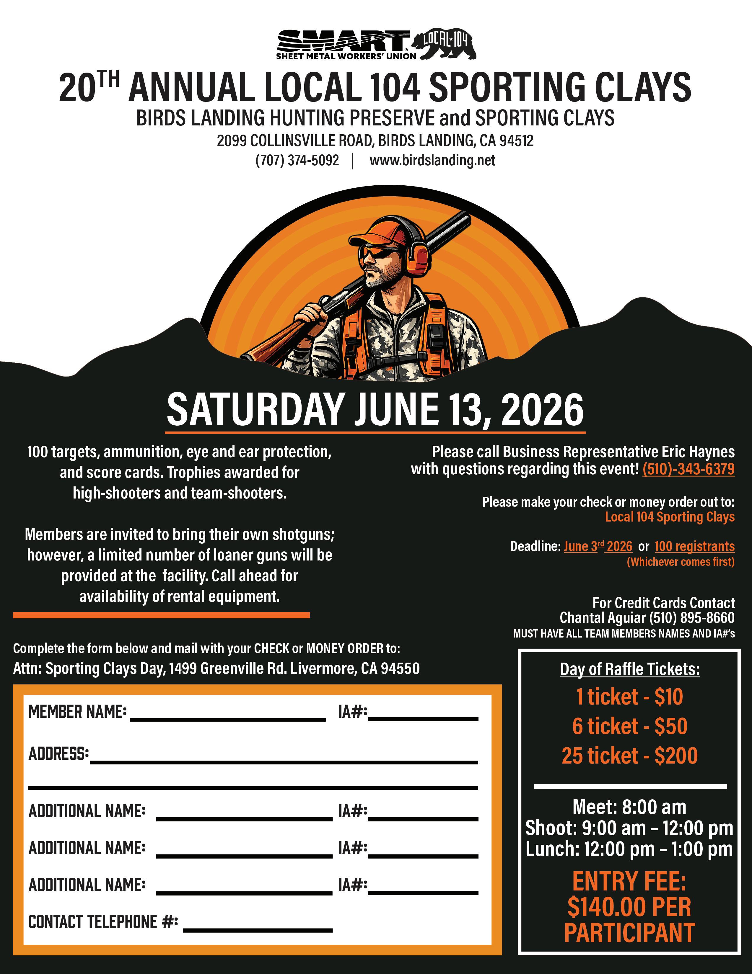 Effective March 2, 2026, office hours for all Local 104 offices have been updated to better serve our membership and improve accessibility to staff and services across the region. The North Bay, East Bay, West Bay, South Bay, Monterey Bay Area, Fresno, Sacramento, Manteca, and Ventura offices will now operate Monday through Friday from 7:30 a.m. to 4:30 p.m. Members are encouraged to plan visits, calls, and appointments during these hours to ensure staff availability and timely support.
