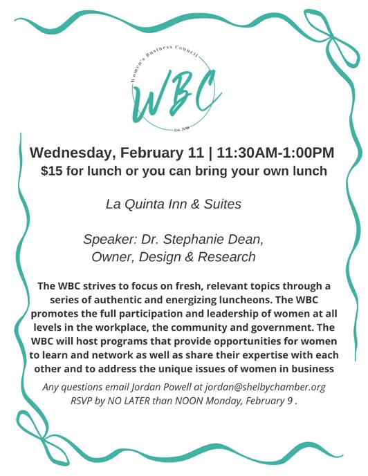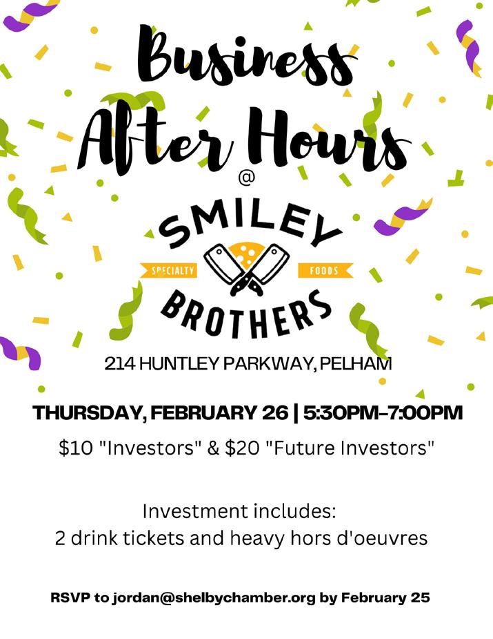 A complimentary lunch will be provided for all attendees. Reservations are requested and space is limited, so please contact the chamber via e-mail at info@ shelbychamber.org, by phone at 205-6634542 or register online, by no later than noon on Monday. Feb, 9 to reserve your place.