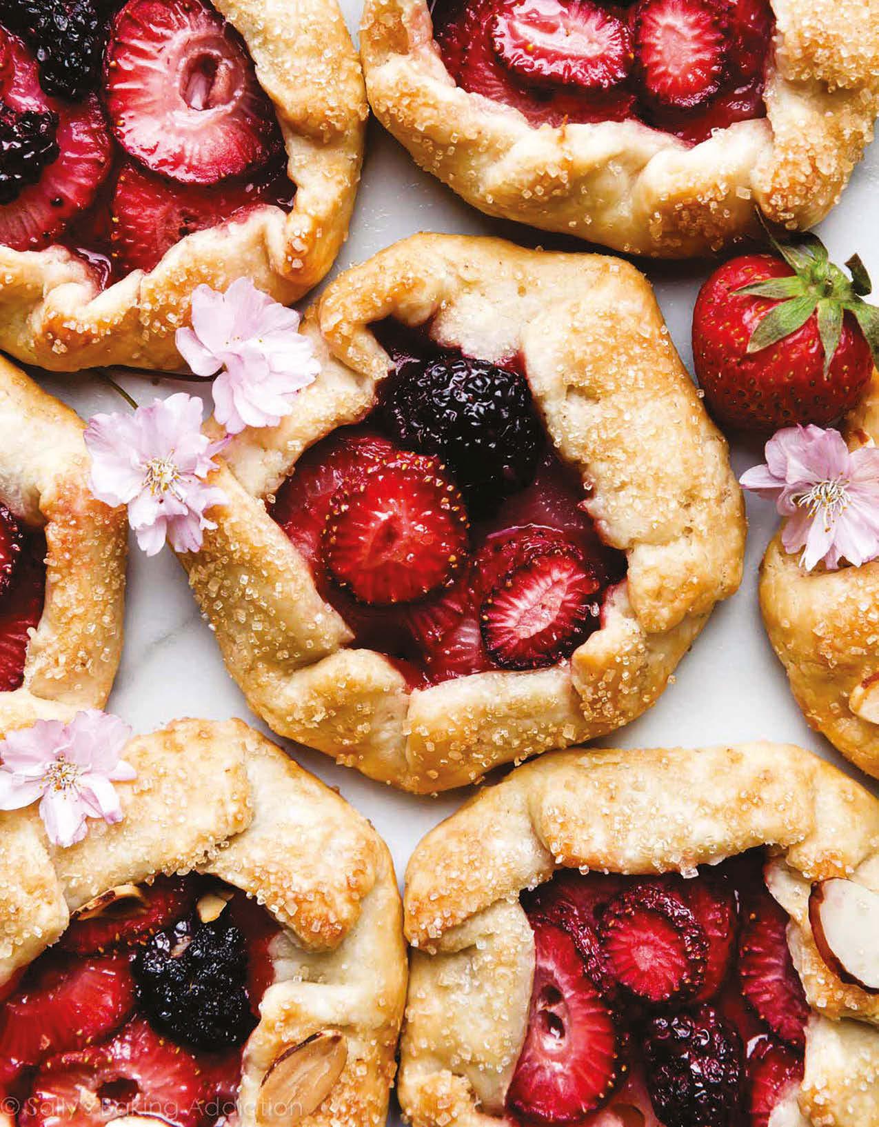 5. Fill galettes: Arrange dough rounds on prepared baking sheets. Remove filling from the refrigerator and spoon about 1/4 cup into the center of each dough round, leaving any excess juice behind in the bowl. Gently and tightly fold the edges over the filling leaving the very center exposed, as you see in the photos and video tutorial. Make sure the mini galettes are tight and compact so they don’t unfold themselves or lose shape while baking.