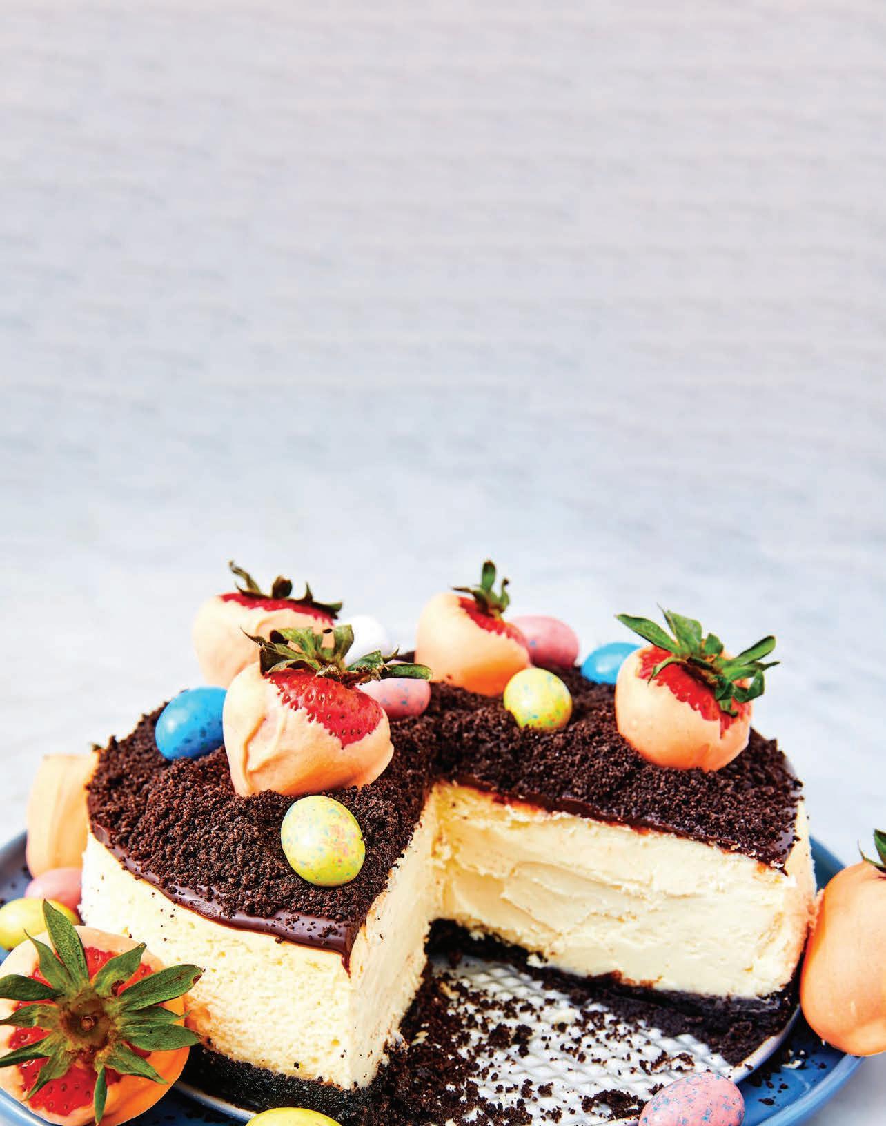 9. Pour ganache over top of cheesecake and smooth into an even layer. Top with an even layer of Oreo crumbs, then add your strawberry “carrots” and Robin’s Eggs. Refrigerate until ganache is set, 10 minutes more.