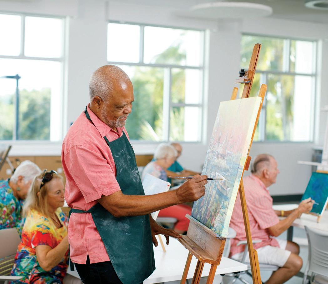 Tribby Arts Center includes a grand entrance and atrium gallery, practice rooms for musicians, dance and theatre arts studio, literary lounge and arts library, and numerous studios for painting, crafts, pottery, quilting, glass and photography, as well as a 400-seat, tiered theatre. Additional amenities include a gift shop featuring resident artwork, a coffee bistro and a sculpture garden that offer delightful spots to create, relax, read and stroll.