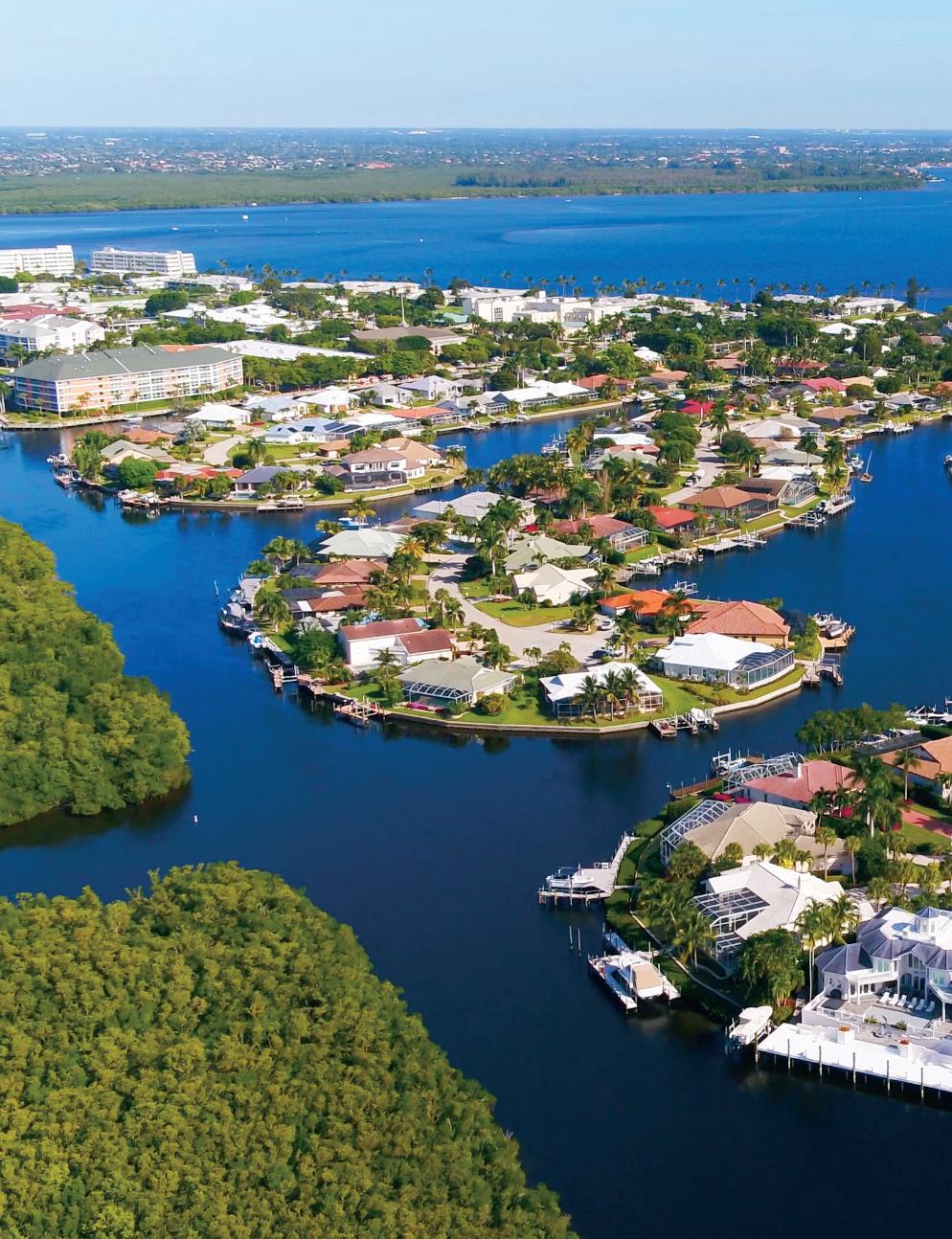 THE ISLAND features a waterfront lifestyle, with many of the residences overlooking the marina, lagoon and the Caloosahatchee River . Dining options, the Island Aquatic Center, as well as several recreational amenities can be found here The Island is also home to King’s Crown assisted living and The Village Church