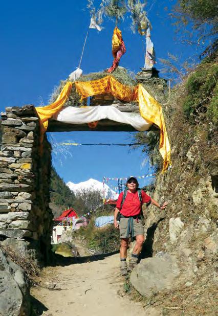 Chris braved hammering winds hiking Larke Pass (16,752') in Nepal. Chris with Grand Teton National Park Superintendent David Vela, who presented her with the “Lifetime Achievement Award” from the Office of the President of the United States “for lifelong commitment to building a stronger nation through volunteer service” in June 2018. Chris became an expert at operating a 49-foot long, 55,000-pound Caterpillar tractor and wagon for supplemental feeding at the National Elk Refuge. Chris at Kani gate at the entrance to the small village, Upper Loh, in the Manaslu region in Nepal.
