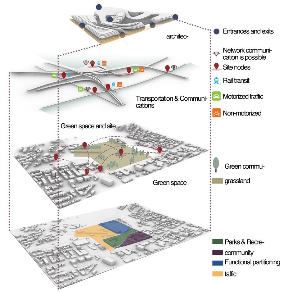 1.Contact people on both sides of the highway. 4. Generate variable module space, placed on the platform, leaving public space. 2. Leave a gathering space between the two sides of the shunt. 5. Some loading and unloading space is set up at the end, which is used to adjust the crowd flexibly. 3. Make a two-layer modular space. 6. The modular combination makes the whole space more flexible, and different levels of use enrich the lives of local people.
