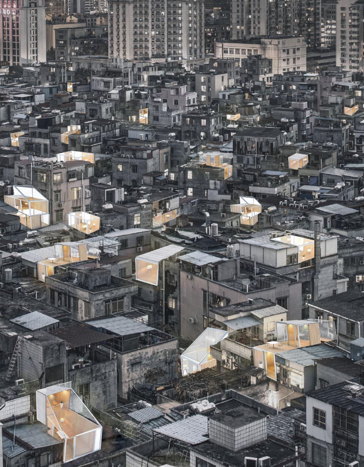 While the individual building serves as a dwelling, the entire outer void is enclosed by glass to protect against wind and rain.