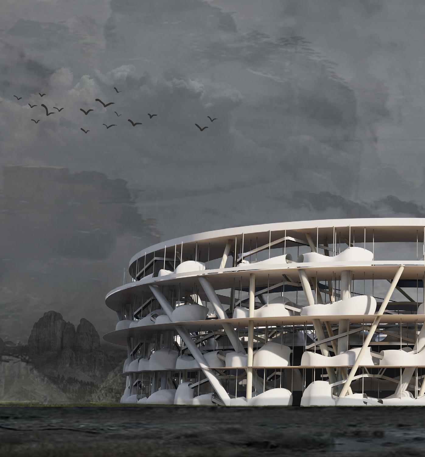 In a city with a large population, it is ironic to design an alarming building. It has the texture of plastic, the texture of concrete, the idea of future life.