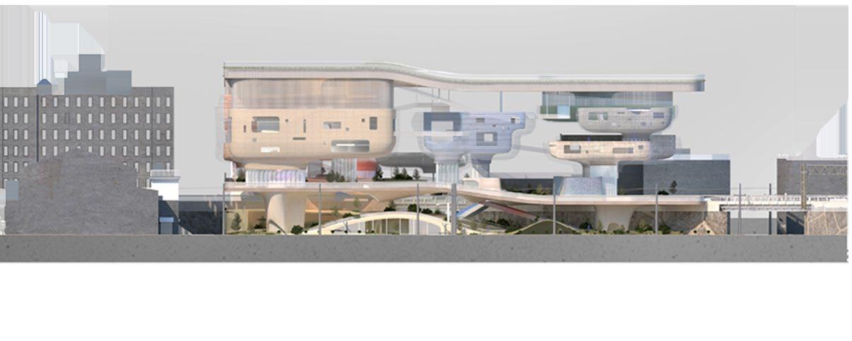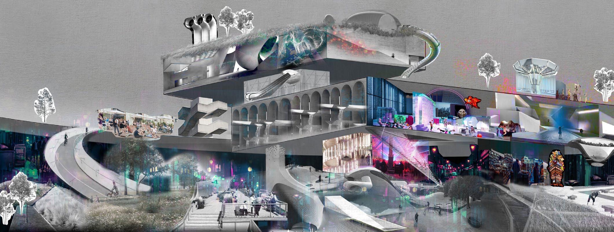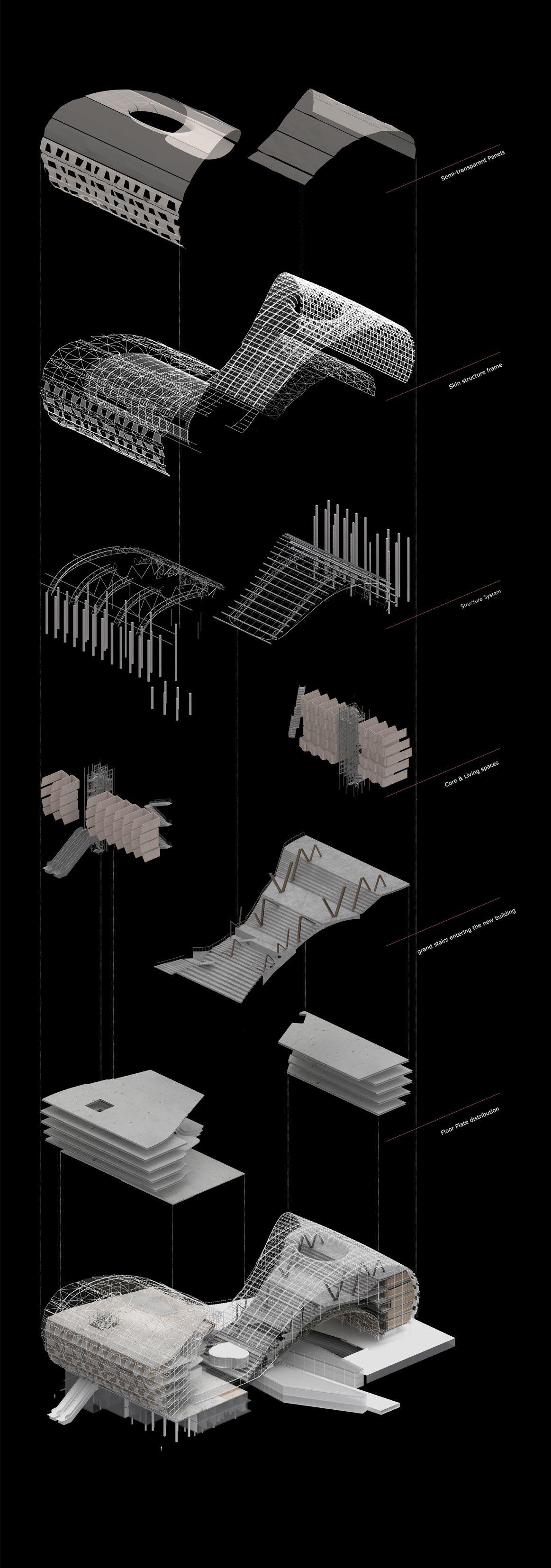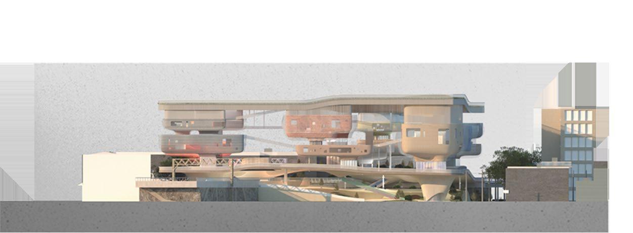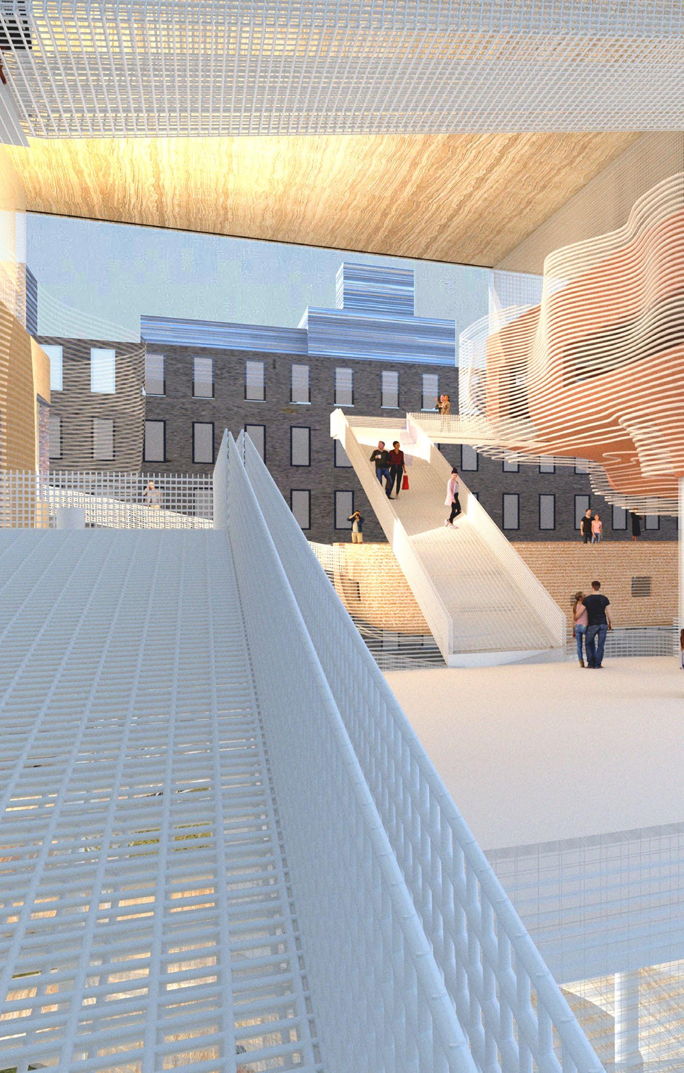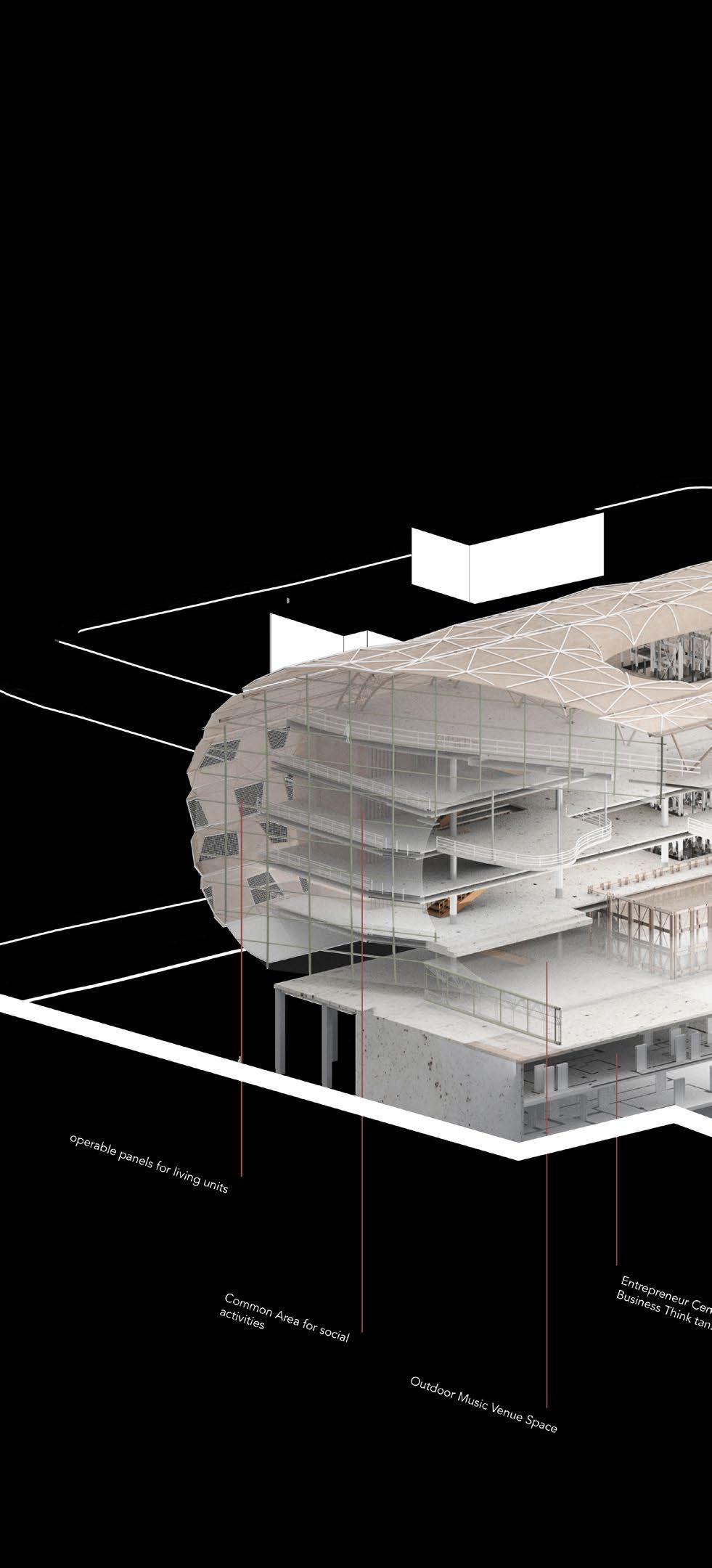 The project seeks to undermine the autonomy of the different programs by rethinking their relationship to the collective public spaces by interconnecting them with a series of catwalk. This empowers the users to define their own way of navigating the project and engaging with the diverse programmatic opportunities that await them.