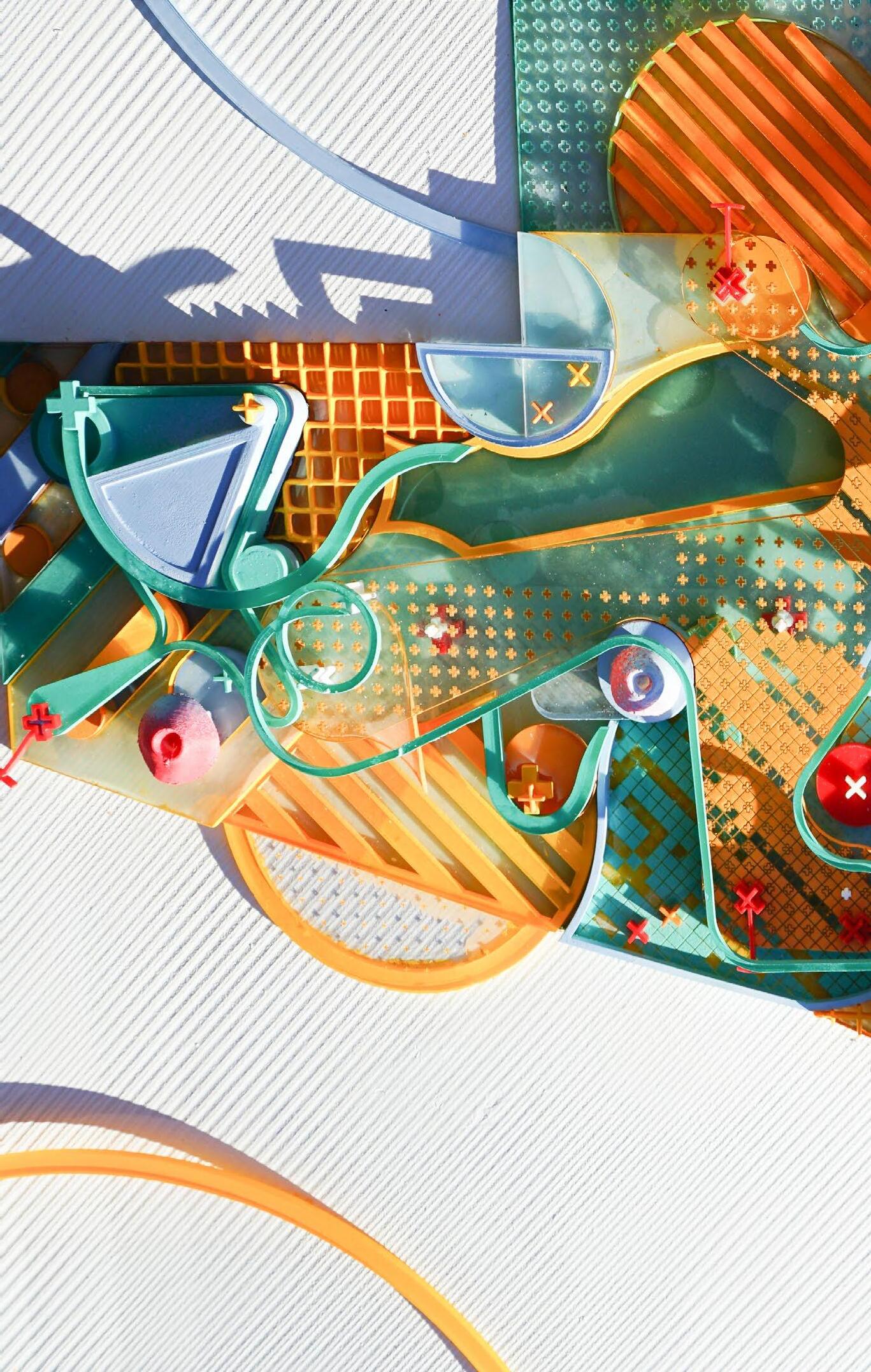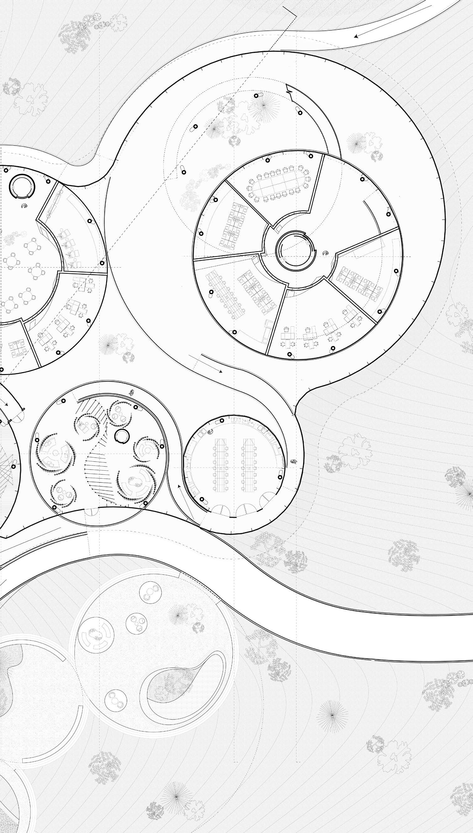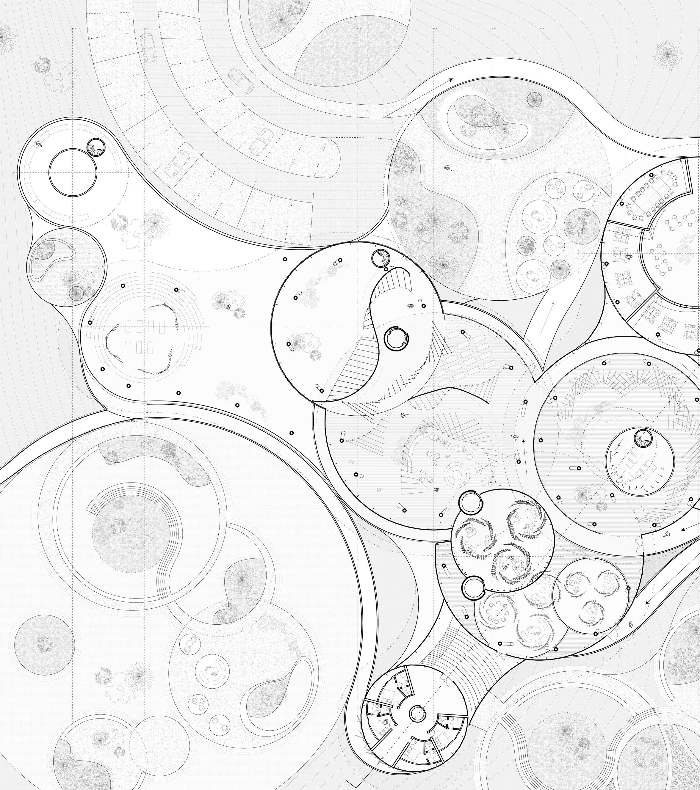 The project reimagines the symbiosis between architecture, agriculture, and nature, drawing inspiration ous complexity of treehouses and Pixel Farming. We aim to develop an organic farming system that transcends weaving each element into This experiential living and ecological mindfulness, providing users with a new The”designing in layers” strategy for a forest garden is structured to maximize diversity and productivity study of circles, curves, and tangent lines, exploring potential combinations and overlaps to define shapes, scale, direction, and movement, aiming to embed tension through color strength, pushing boundaries and namic, and flexible zones within our rule-based system.