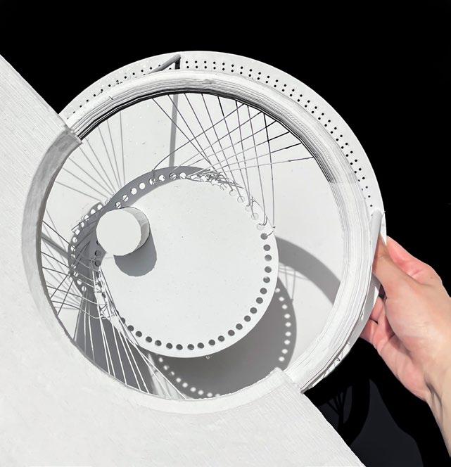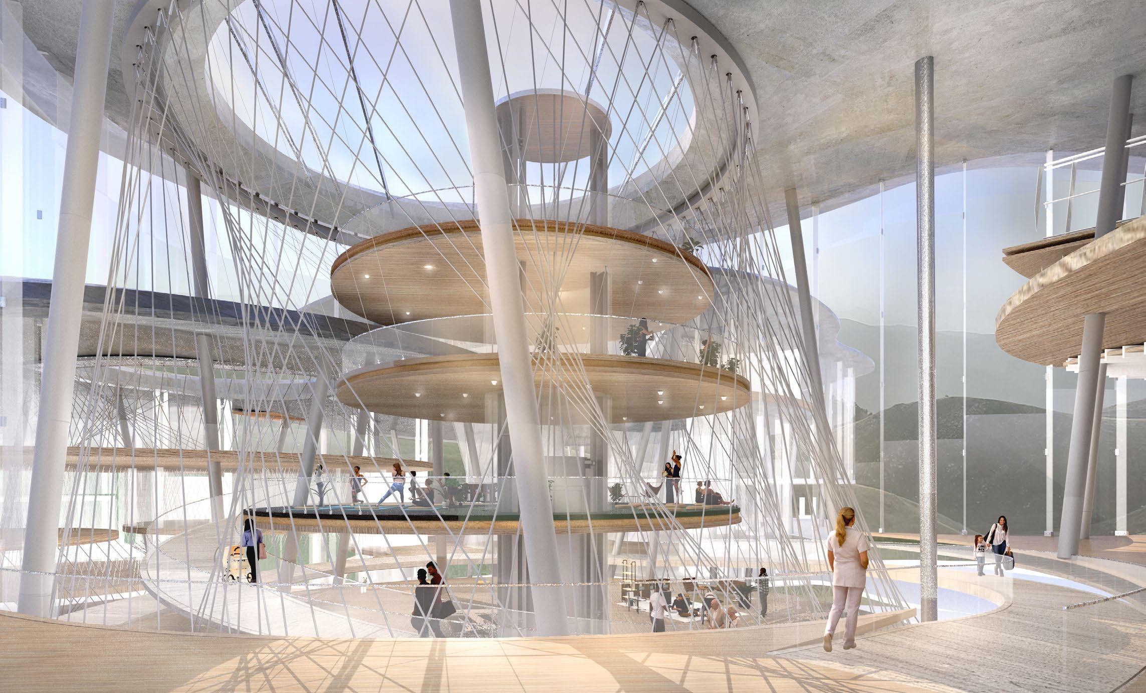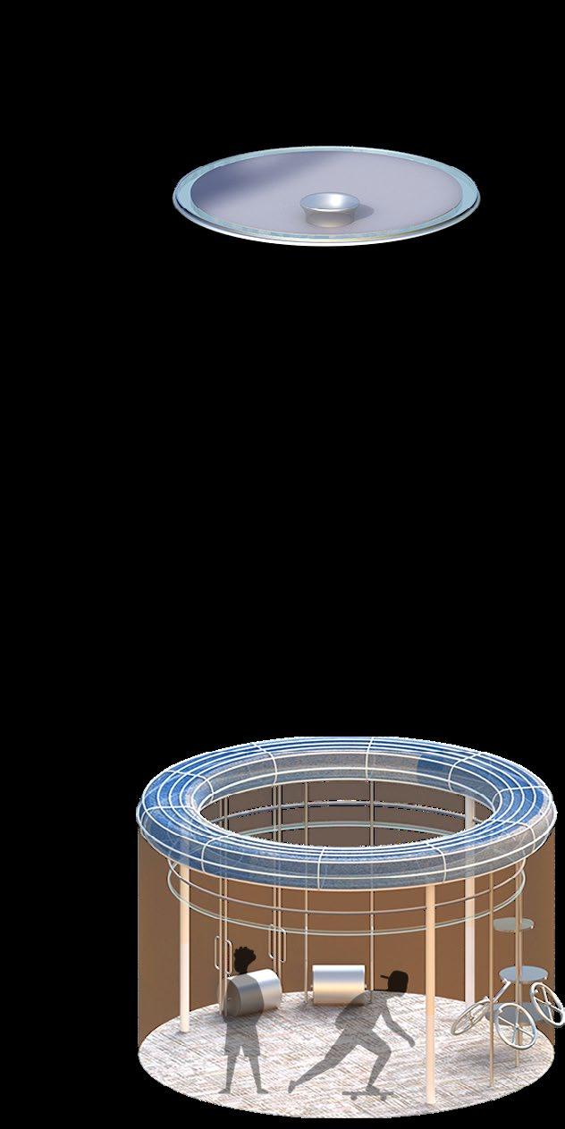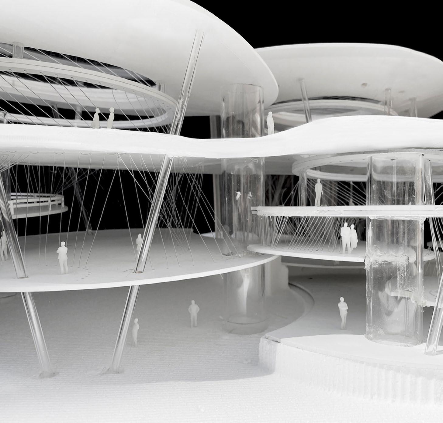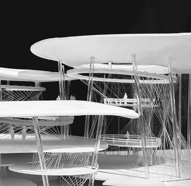 To implement this system on a larger scale, we opted for a single form, the circle, as our primary architectural element due to its ability to evenly distribute forces and eliminate any structural dead ends. By adjusting the density, slope, and orientation of the cables and columns, the structural system seamlessly transforms into space dividers, giving rise to unique environments tailored to specific programs.