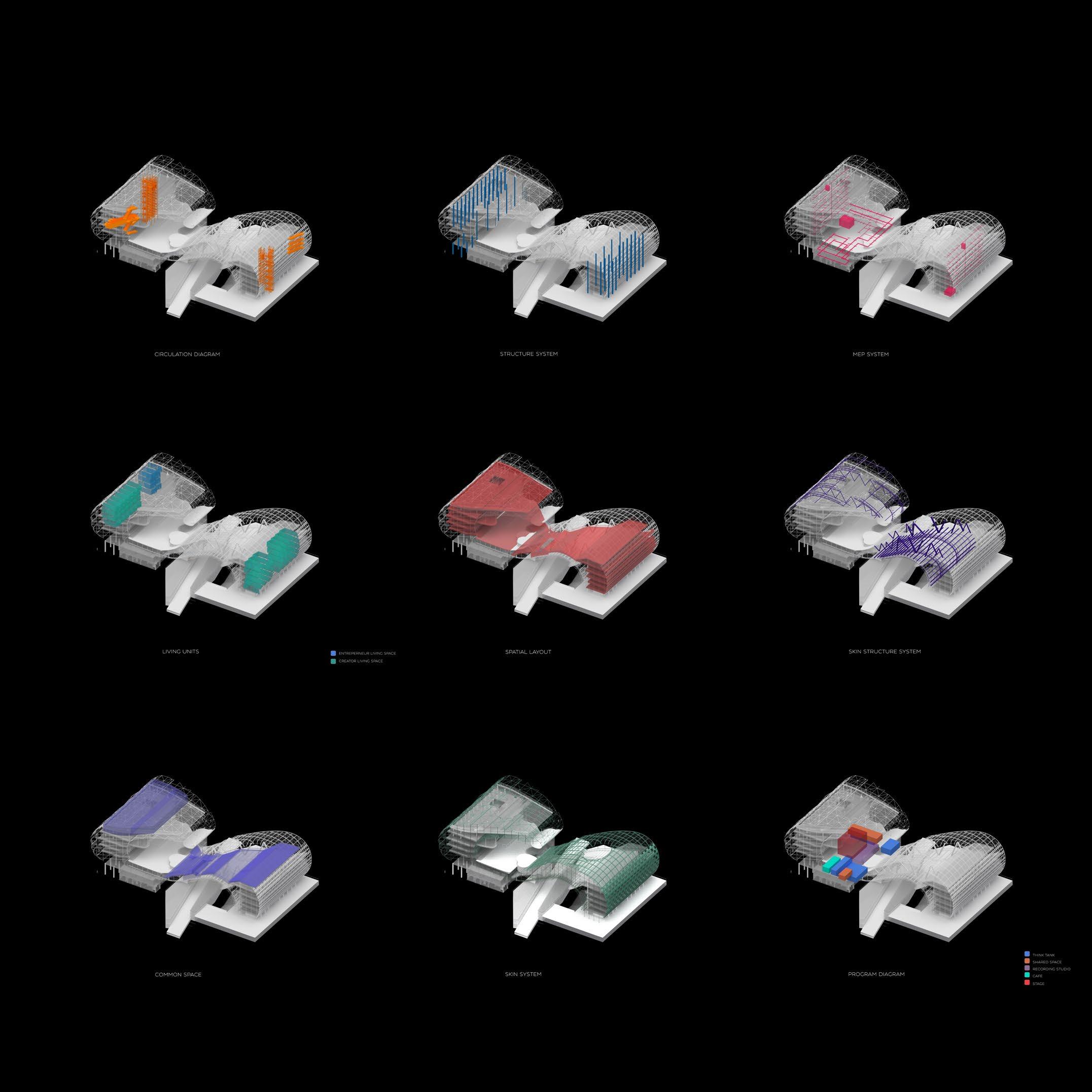 The intention of this project is to boost the music tradition around the west part of Philadelphia and connect the local people with music creators and entrepreneurs. The idea is inspired that architecture is solidified music. The choice of geometric motif is based on the idea of an infinity loop, where there is no end and beginning of traveling through the space. The dialogue between the old bandstand studio and the new building was achieved by connecting the original playroom of the bandstand building and bond the new and the new music cultures together with the public music venue space.