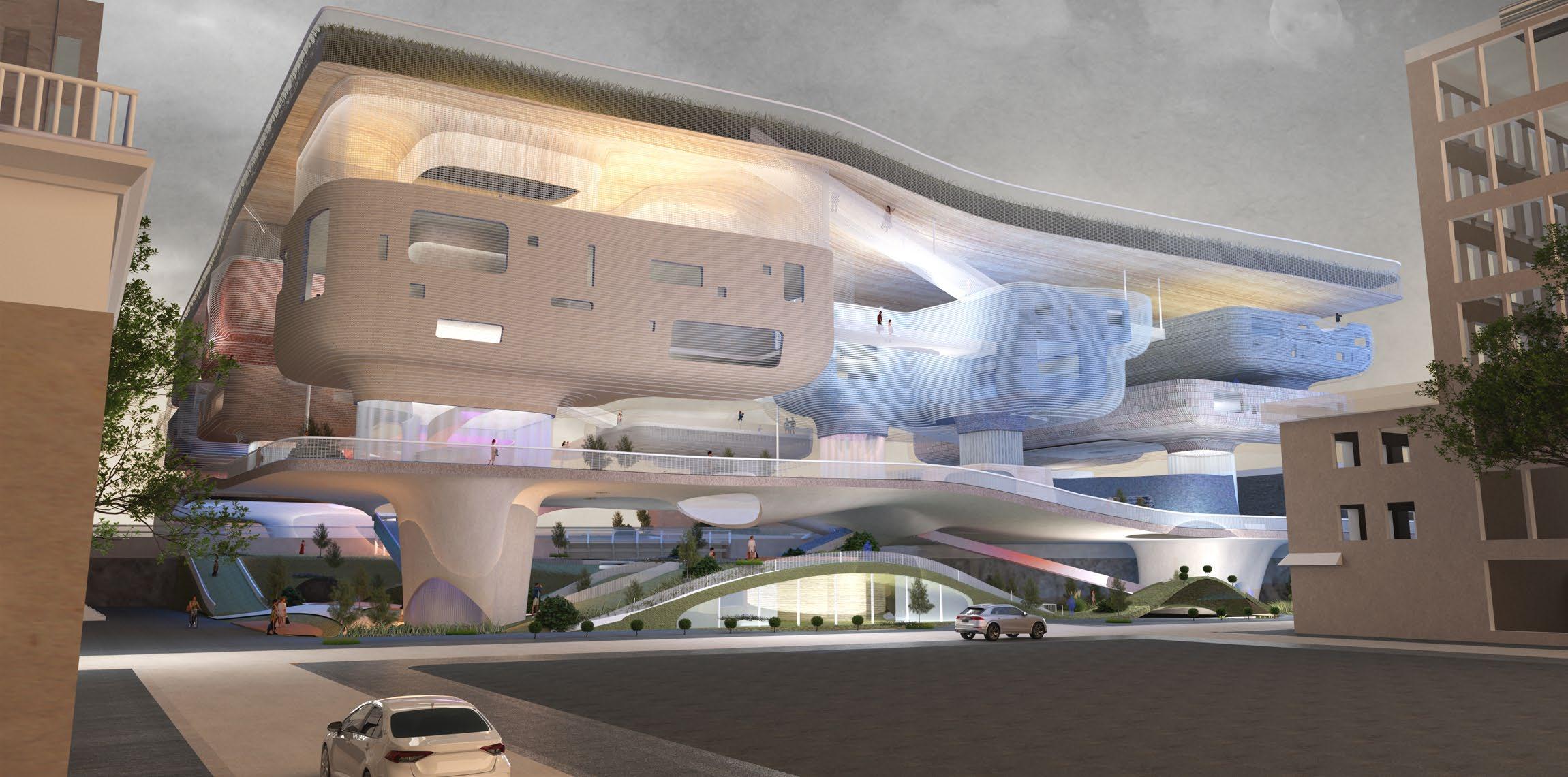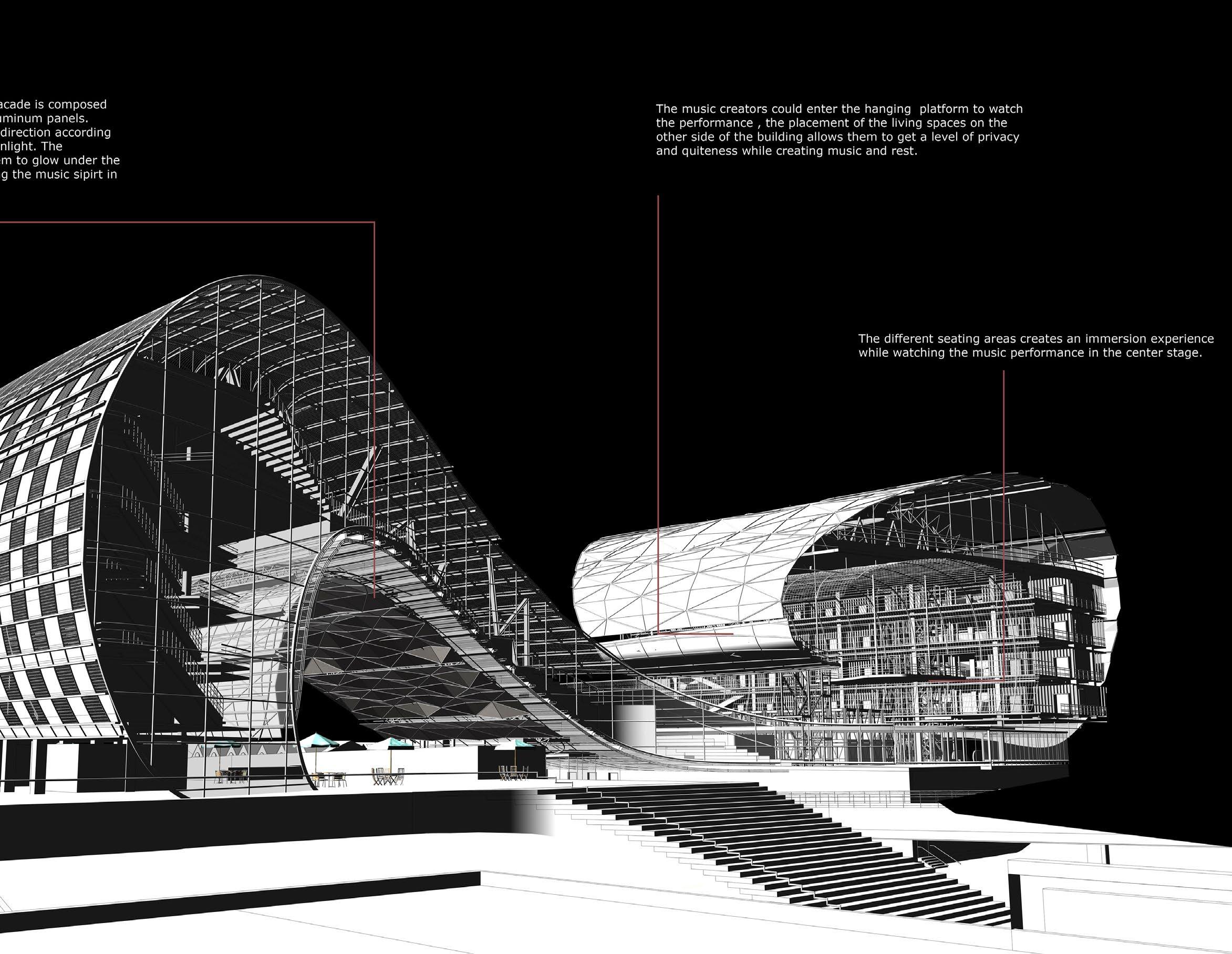 The building facade is intentionally crafted with two distinct design languages, catering to two groups of music creators—embracing both the contemporary realm of new pop music and the timeless tradition of old jazz. On one side, orthogonal panels create a structured and uniform aesthetic, offering an ordered sequence tailored to the preferences of jazz music creators. This deliberate angular division of facade panels not only establishes a dynamic coherence but also seamlessly integrates the musical essence with the living spaces of the creators.
