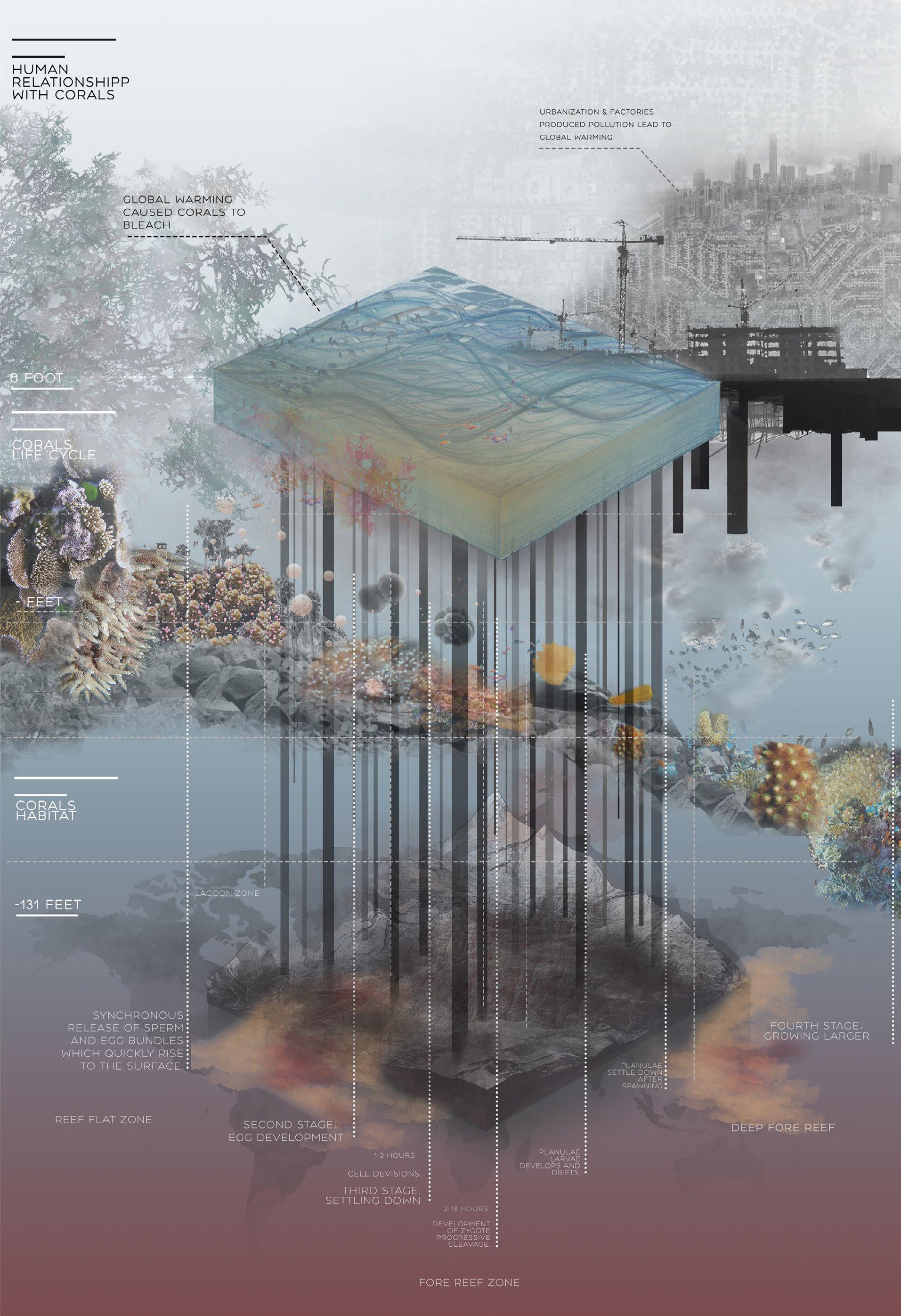 Giant coral reefs that are made by the real bleached corals with touch sensors that could change the color of the