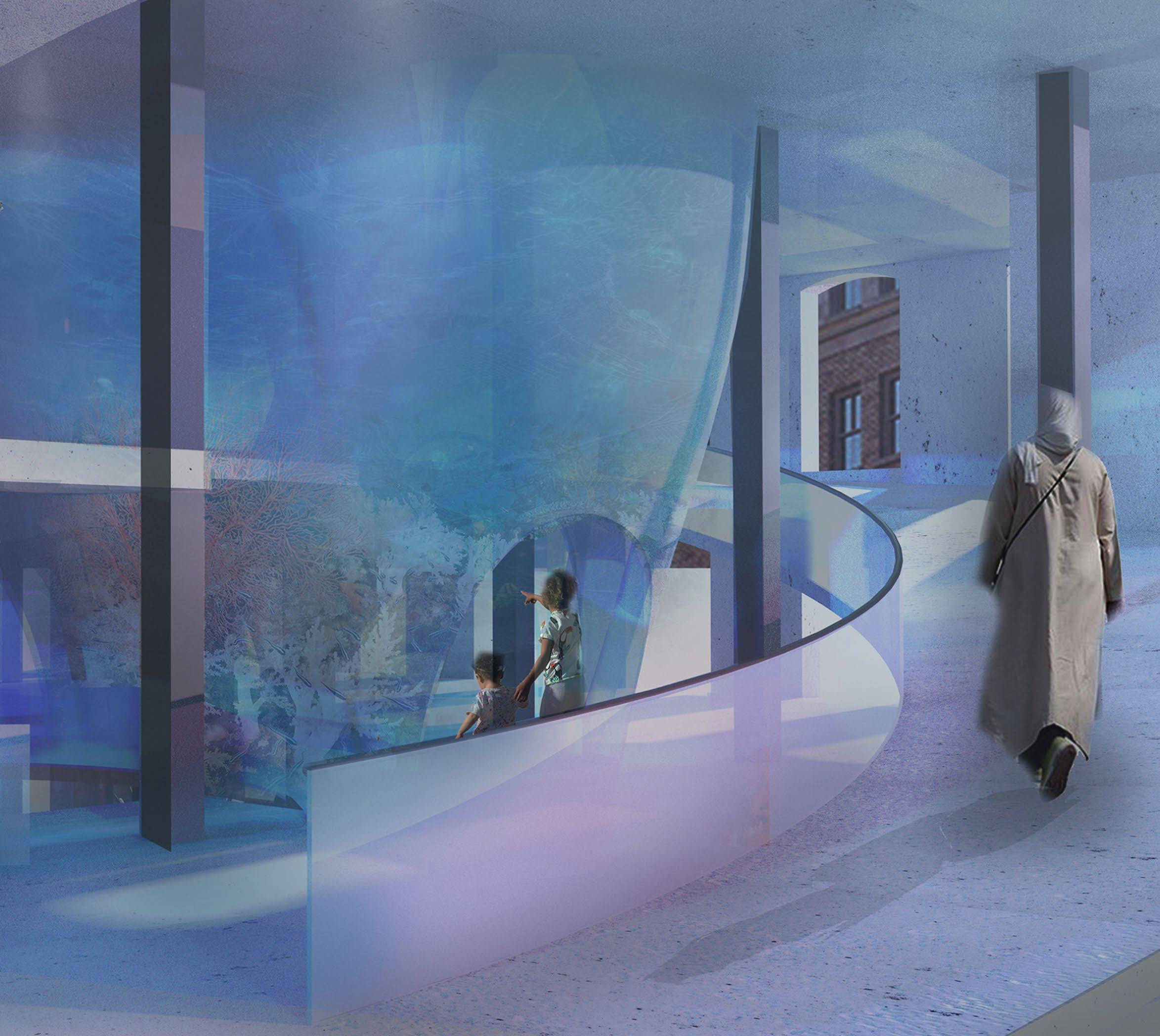 The dome structure in the ground entrance point creates a feeling of immersion like underwater to prepare the users