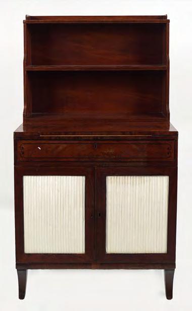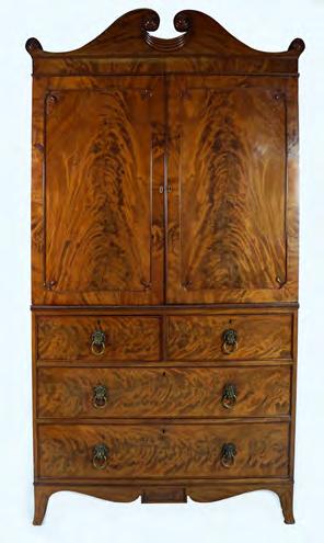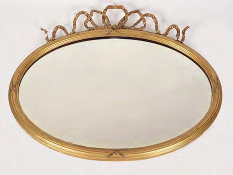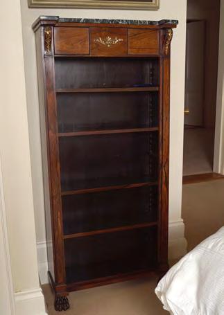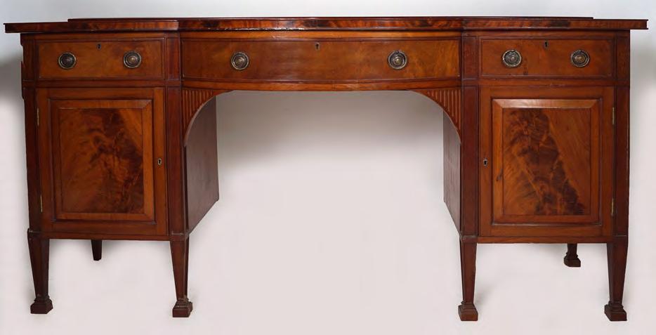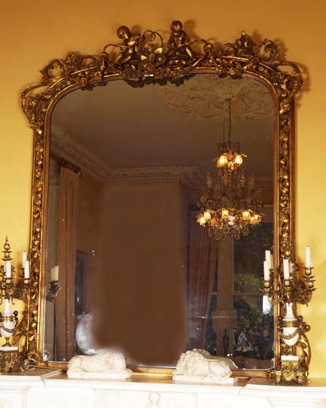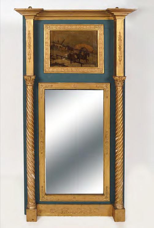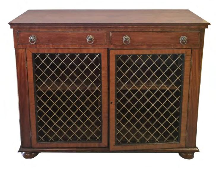 the rectangular bevelled plate between sphinx headed pillars below an anthemion leaf decorated turning and a moulded inverted breakfront pediment. Provenance: Killoughter House, Ashford, Co. Wicklow. 120 cm. high; 150 cm. wide