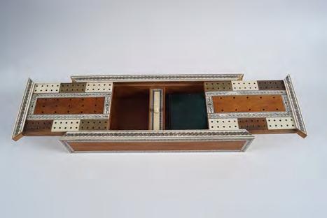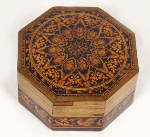 each with a profusely inlaid crown below a pierced fretwork broken arched swan-neck pediment above two geometrically glazed doors. The projecting base of two urn inlaid panelled doors, raised on bracket feet. 240 cm. high; 105 cm. wide; 38 cm. deep
