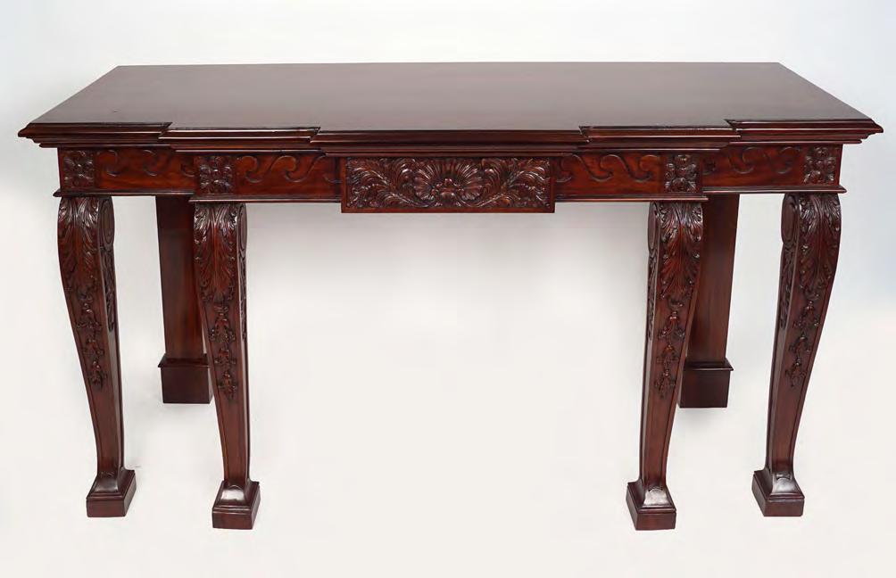 Irish 18th-century mahogany side table, the rectangular moulded edged top, above a conforming frieze, over a mask centred apron, raised on acanthus leaf headed cabriole legs, terminating on claw and ball feet. 77 cm. high; 151 cm. wide; 64 cm. deep