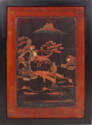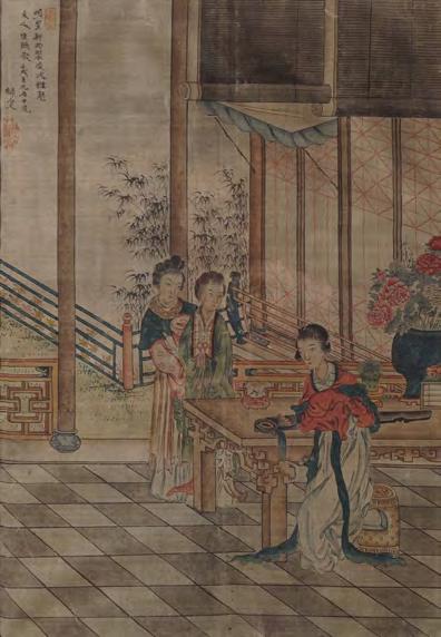 depicting a chinoiserie figure on a swing with assistant amongst exotic trees and blossoms. Image size: 66 x 47 cm.; framed: 77 x 60 cm.