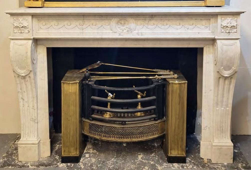 the inverted moulded edged mantel above a swag draped table flanked by Sienna fluted inlaid panels, raised on sheaf of wheat panel headed Sienna marble inlaid pillars. 145 cm. high; 180 cm. wide; 15 cm. deep